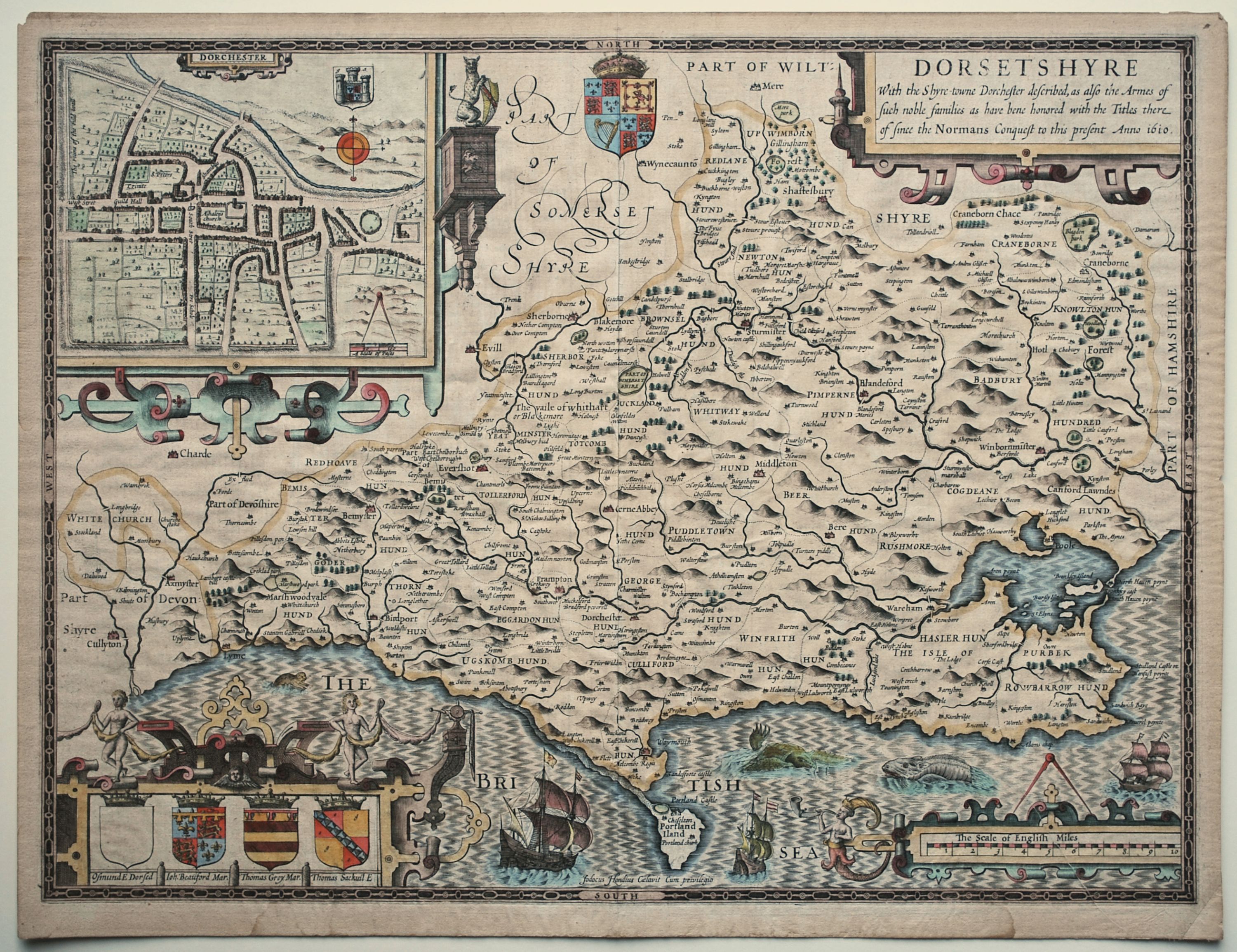 Coloured map of Dorset from the early Sudbury & Humble Latin edition of John Speed’s famous atlas of the British Isles entitled “Theatre of the Empire of Great Britain”. One of the most delightful maps of available of the county, it includes an inset plan of the town of Dorchester and the arms of the noble families of the county. The map is also decorated with a curious horn-playing figure, sea monsters, sailing ships, finely engraved strapwork flourishes and the Royal coat of arms. A description of the county appears on the verso in Latin. Other than a repair to the bottom right corner not affecting the image and some minor water staining to the bottom blank margin, a lovely example in excellent condition. 38 cm x 50.5 cm