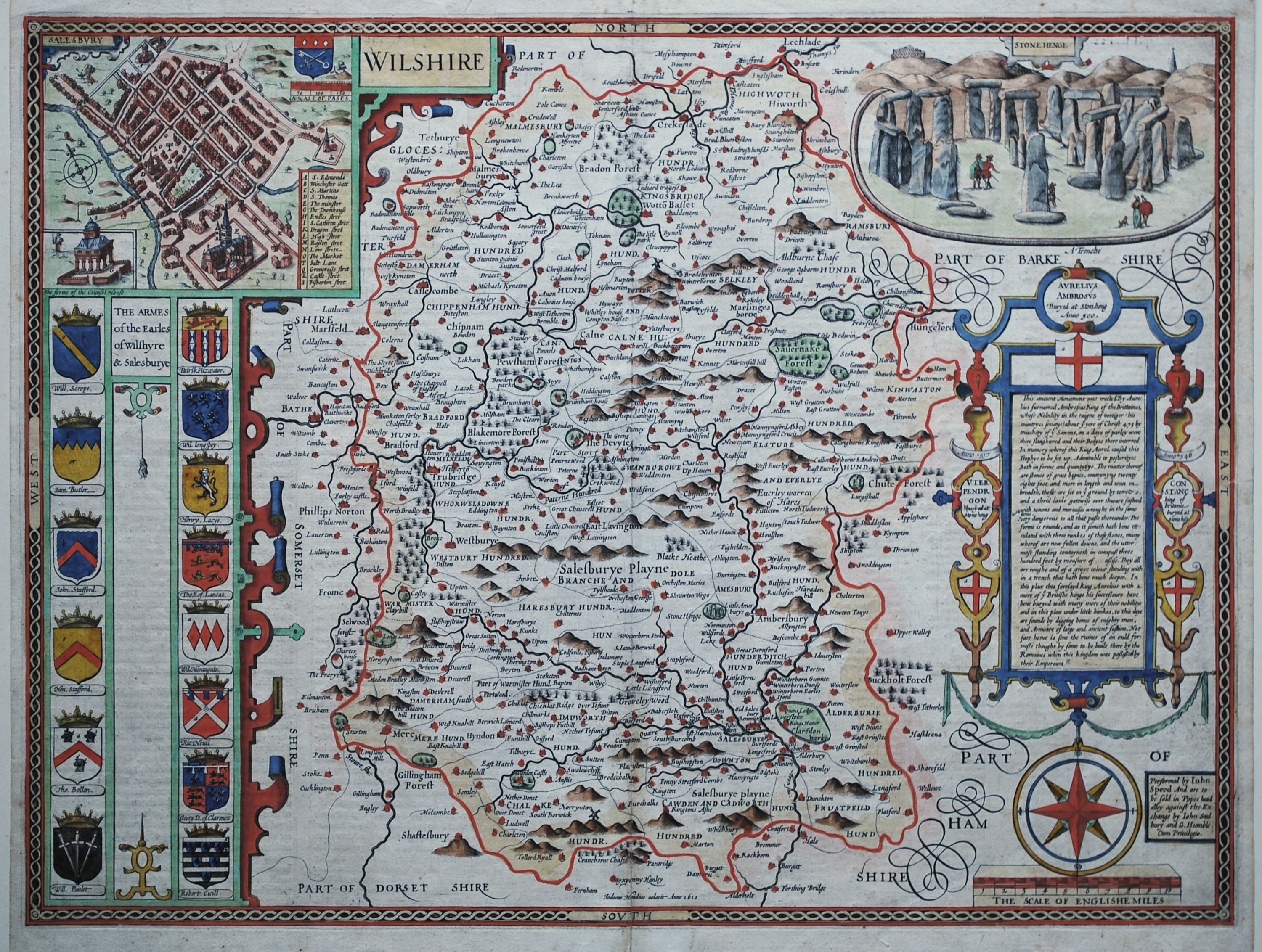Coloured map of Wiltshire from the first John Sudbury and George Humble edition of John Speed’s “Theatre of the Empire of Great Britain”. Certainly one of the most decorative maps of the county, it is highlighted with a striking and naïve view of Stonehenge. Inset is a plan of the town of Salisbury together with the arms of the noble families of the county. A description of the county appears on the verso in English. The map has professional repairs to minor marginal defects and a bottom centrefold split; otherwise a superbly coloured, strong dark impression on heavy paper in excellent condition. 38.5 cm x 51 cm