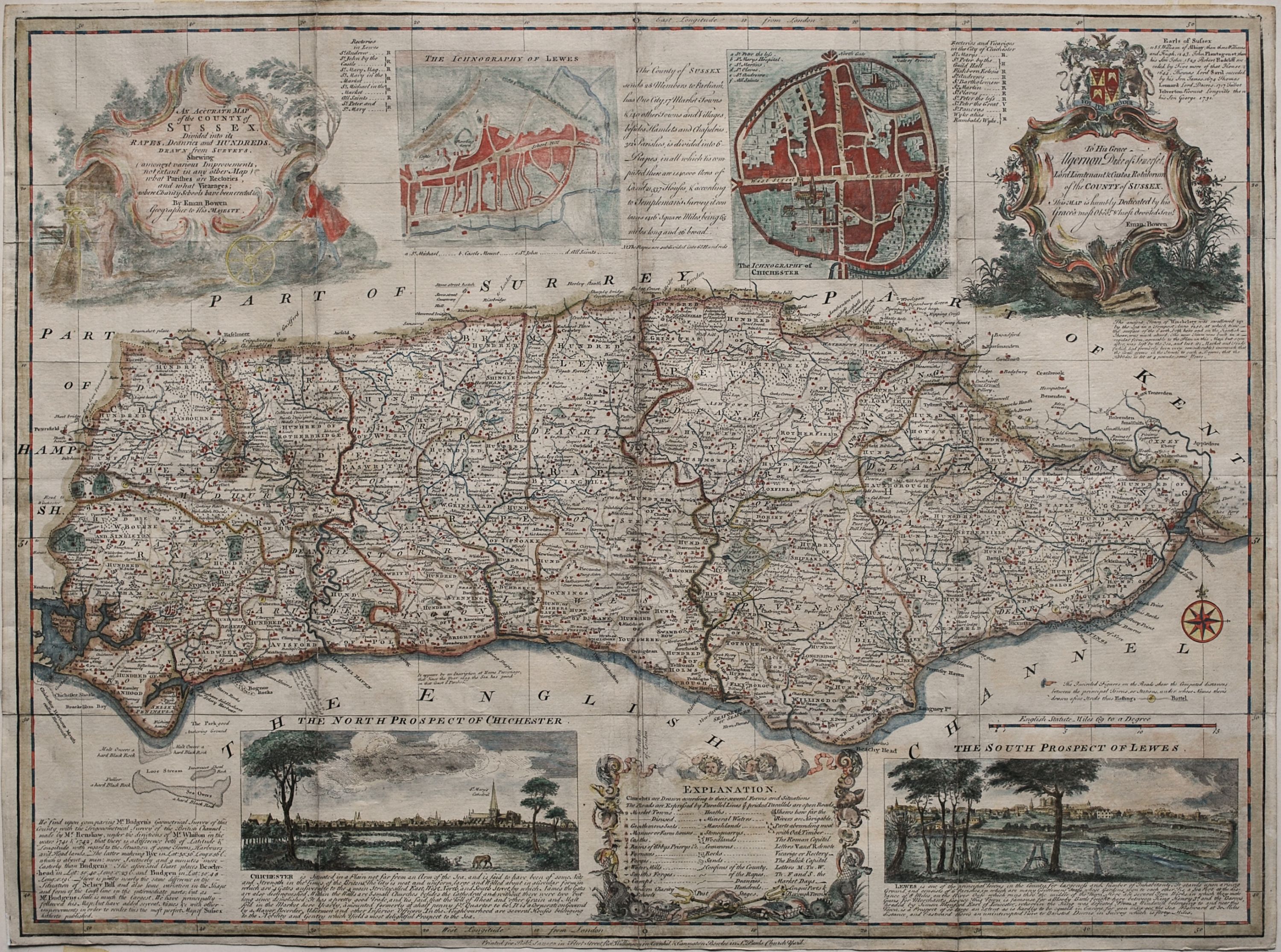 Coloured map of Sussex taken from “The Large English Atlas” by Emmanuel Bowen and Thomas Kitchin, first published in 1749 and considered to be among the finest English county maps of the 18th century. Publishers’ inscription reads: “Printed for Robt. Sayer… Robt. Wilkinson and Carington Bowles…” As with most maps from this atlas, all available space is filled with detailed notes and descriptions of the history and topography of the county and its towns. The map also contains inset plans of Lewes and Chichester, views of the north prospect of Chichester and the south prospect of Lewes and an explanation cartouche containing a key that details the symbols used. Blank verso. Other than reinforcement to the folds verso, a strong, dark impression on heavy paper in very good condition. 50.5 cm x 68.5 cm