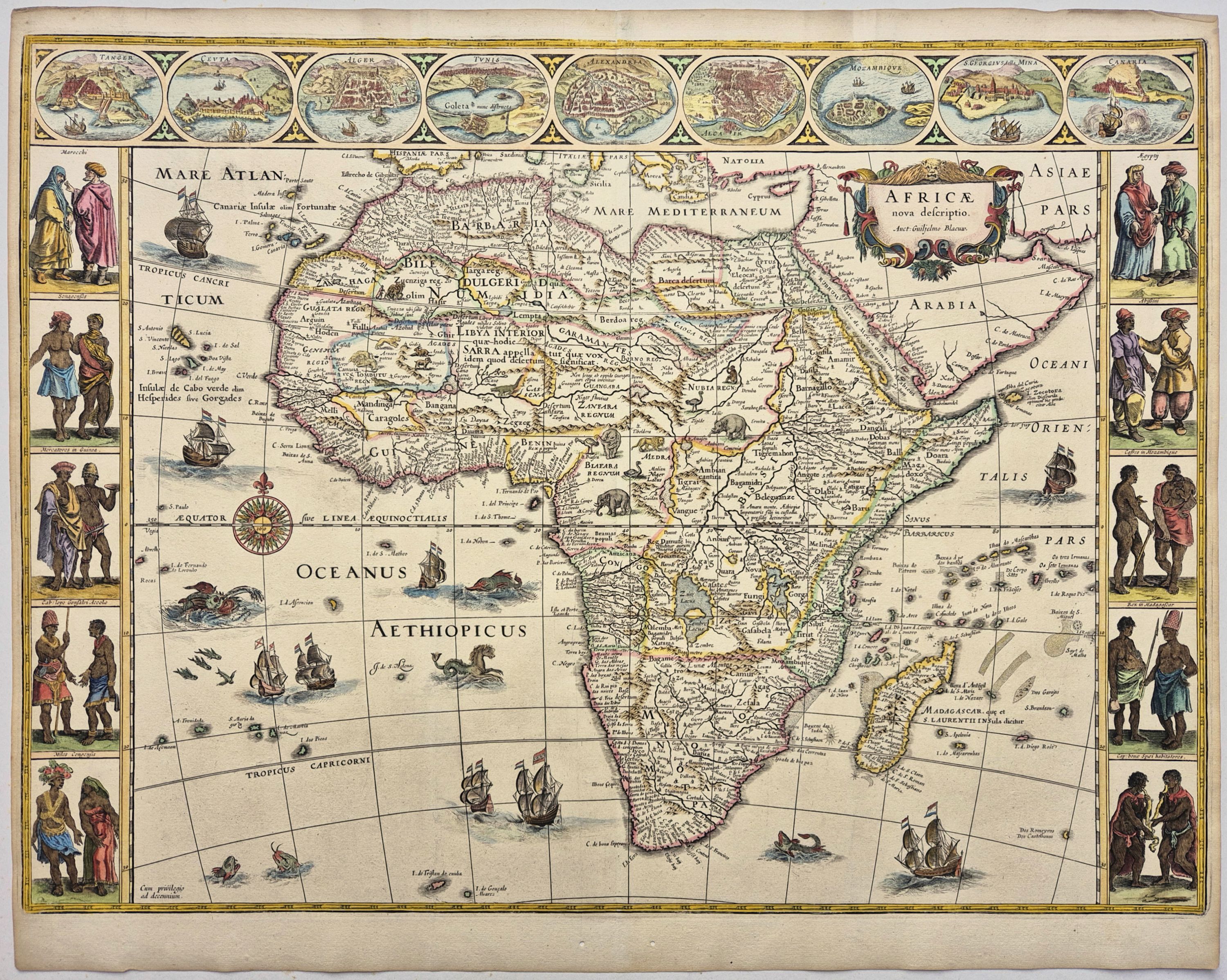 Beautifully coloured carte à figures map of Africa by Willem Janszoon Blaeu from the golden age of Dutch cartography. Appearing separately around 1620, the map, with minor modifications, continued to be published and included in Blaeu’s landmark atlases, “Atlas Novus” and “Atlas Maior” until 1672. Africa’s coastal regions are mapped in great detail with towns and tribal kingdoms shown. However, the geography of the interior, which was largely unexplored by Europeans at the time, is sparely documented and instead populated with animals (elephants, lions, crocodiles, etc.). It is decorated across the top with views of nine cities of the region, including Tangiers, Tunis, Algiers, Alexandria and Cairo, and panels down both sides depicting men and women from different parts of Africa in native dress. Unusually for Blaeu maps, it is blank verso, so it may have been issued separately. Other than two tiny wormholes in the bottom blank margin, a lovely example with tight side margins in very good condition. 41 cm x 55 cm