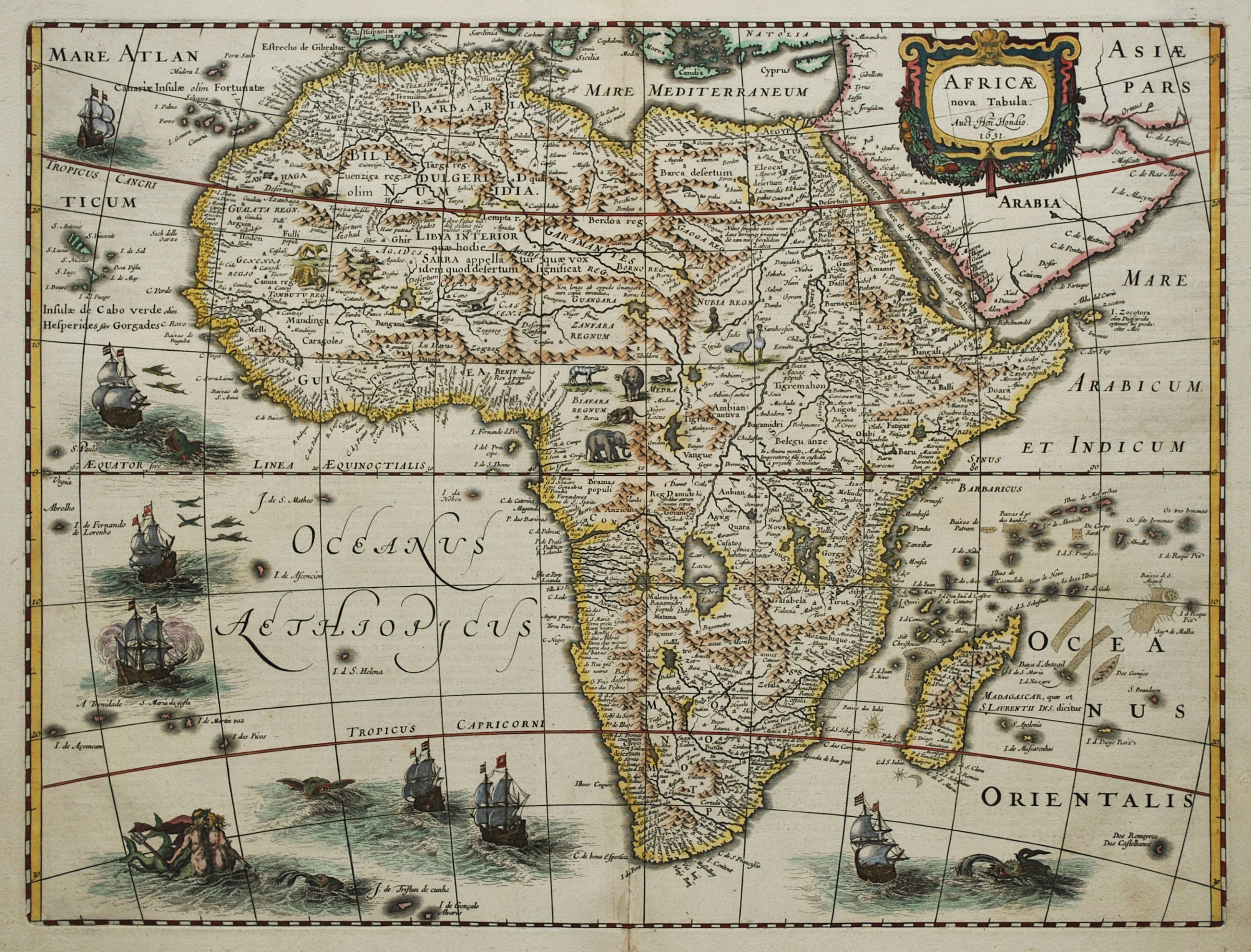 Coloured map of Africa by Jodocus Hondius from a German edition of Henricus Hondius’ reissue of Mercator’s Atlas. When Henricus obtained the plate he re-engraved several sections, principally in the oceans, added the date of 1631 along with his name to the title cartouche and removed the decorative borders on all four sides of the map that appeared in Jodocus’ original carte-a-figures version. This finely engraved map includes many ornamental features including several sailing ships and sea monsters along with an image of Neptune and a mermaid in the lower left. In common with Africa maps of the period, since little was known of the continents’s interior several areas only show indigenous animals including elephants, lions and crocodiles. A description of Africa appears on the verso in German. Other than a repair to a bottom centrefold split, the map is a finely coloured, strong dark impression on heavy stable paper with wide margins in excellent condition. 38 cm x 50 cm