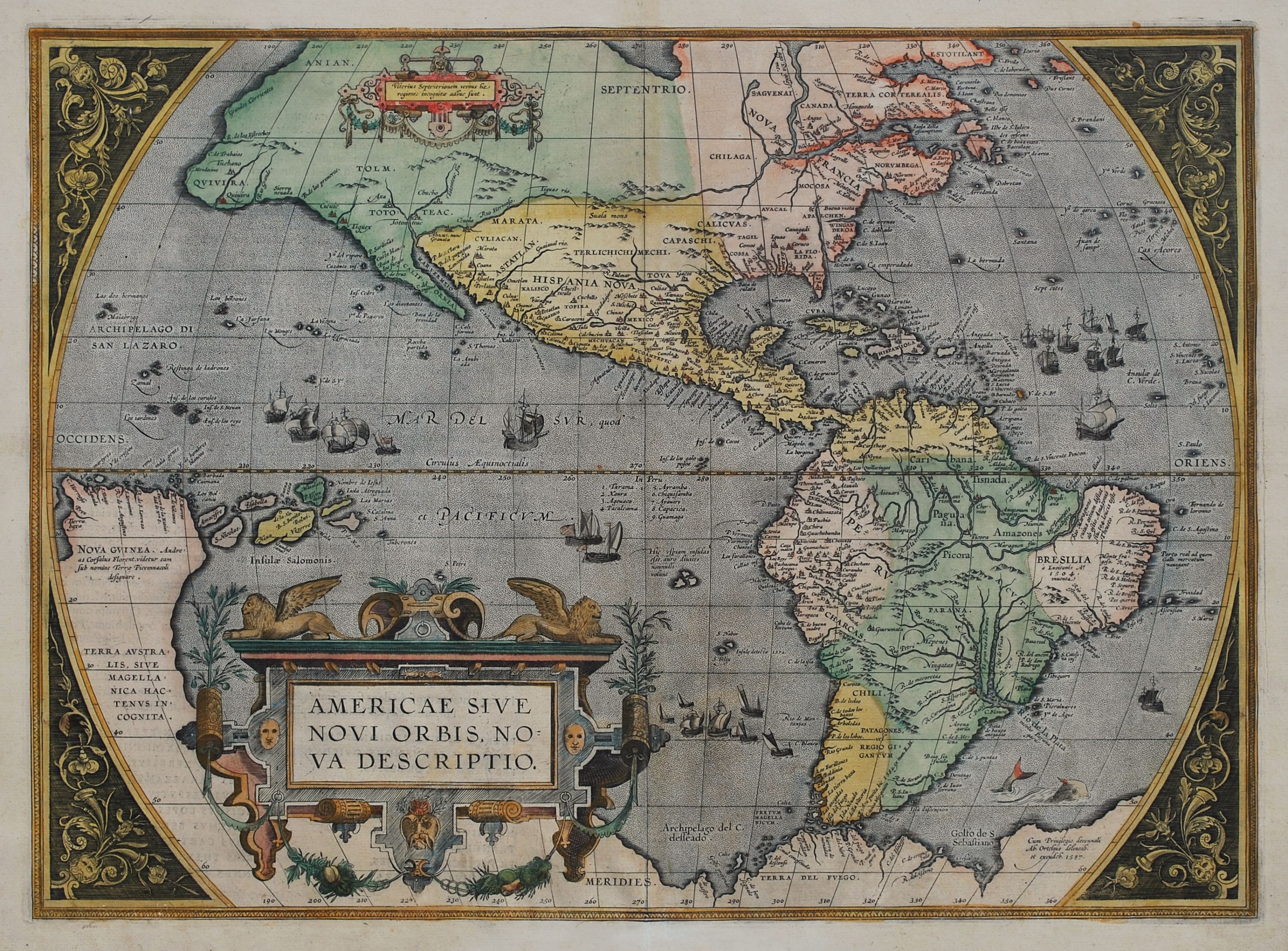 Old coloured map of North and South America from the 1592 Latin edition of Abraham Ortelius’ landmark atlas “Theatrum Orbis Terrarum”, the first modern atlas of the world. This example, which is the third and final state of this map, first appeared in the Ortelius atlas in 1587 and is principally based on Mercator’s 1569 world map. Changes made to this third state include a much more realistic depiction of South America by the removal of the bulge on its south-west coast and the addition of newly discovered cartographic details, such as the inclusion of the Solomon Islands off the east coast of an oversized New Guinea, the addition of an inlet (presumably the Chesapeake Bay) on the mid-Atlantic coast of North America and the use of the name “California” on the peninsula on its west coast. A description of the region appears on the verso in Latin. Other than a professional repair to a short bottom centrefold split, the map is a lovely example with wide margins on heavy, stable paper in excellent condition. 35.5 cm x 49 cm