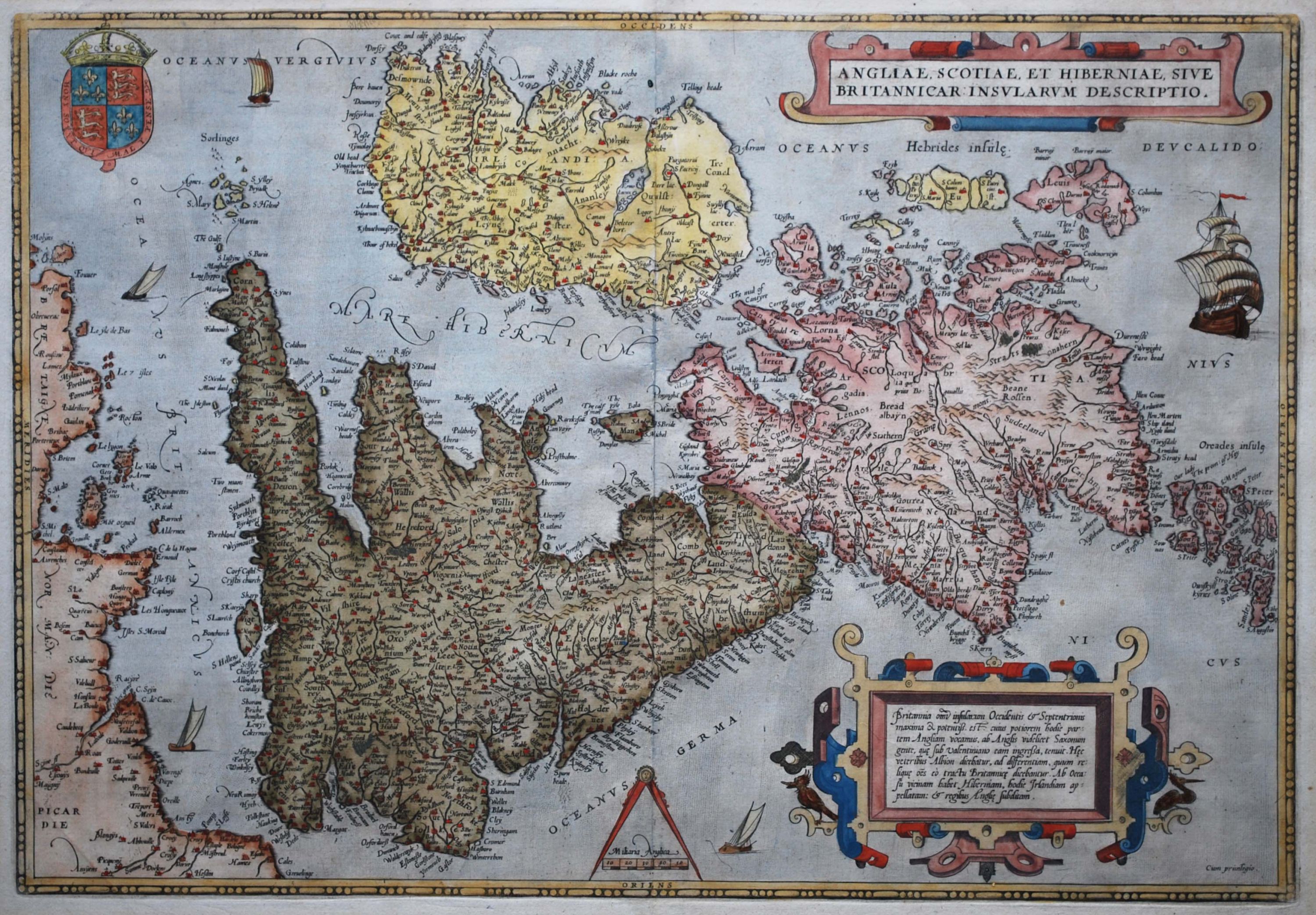 Finely coloured map of the British Isles from the 1579 Latin edition of Abraham Ortelius’ landmark atlas “Theatrum Orbis Terrarum”, the first modern atlas of the world. This map, which was included in the Ortelius atlas since it was first published in 1570, is based on the landmark Mercator map of the British Isles issued in 1564 as well as information taken from Saxton and Llhuyd. Unusually oriented to the west, as was the usual case in the older Ptolemaic maps, the map is decorated with several sailing ships and an elaborate cartouche that contains a brief description of the British Isles in Latin. A more detailed description of the area appears on the verso in Latin. The map is in excellent condition. 34.5 cm x 50 cm
