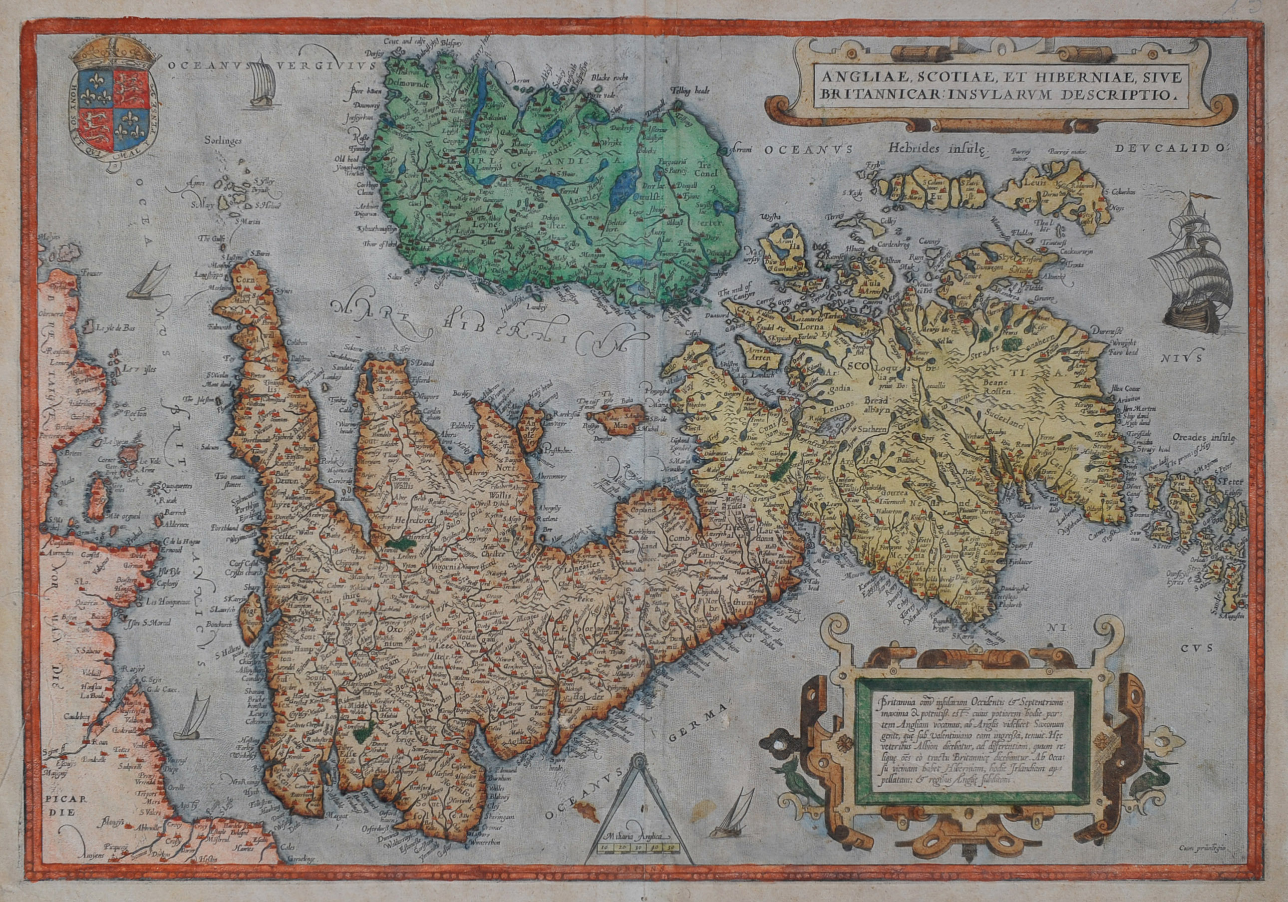 Coloured map of the British Isles from the 1580/1589 German edition of Abraham Ortelius’ landmark atlas “Theatrum Orbis Terrarum”, the first modern atlas of the world. This map, which was included in the Ortelius atlas since it was first published in 1570, is based on the landmark Mercator map of the British Isles issued in 1564 as well as information taken from Saxton and Llhuyd. Unusually oriented to the west, as was the usual case in the older Ptolemaic maps, the map is decorated with several sailing ships and an elaborate cartouche that contains a brief description of the British Isles in Latin. A more detailed description of the area appears on the verso in German. The map is in excellent condition with the exception of a small rust spot and related offset mark; otherwise a superb, beautifully old-coloured example. 34.5 cm x 50 cm