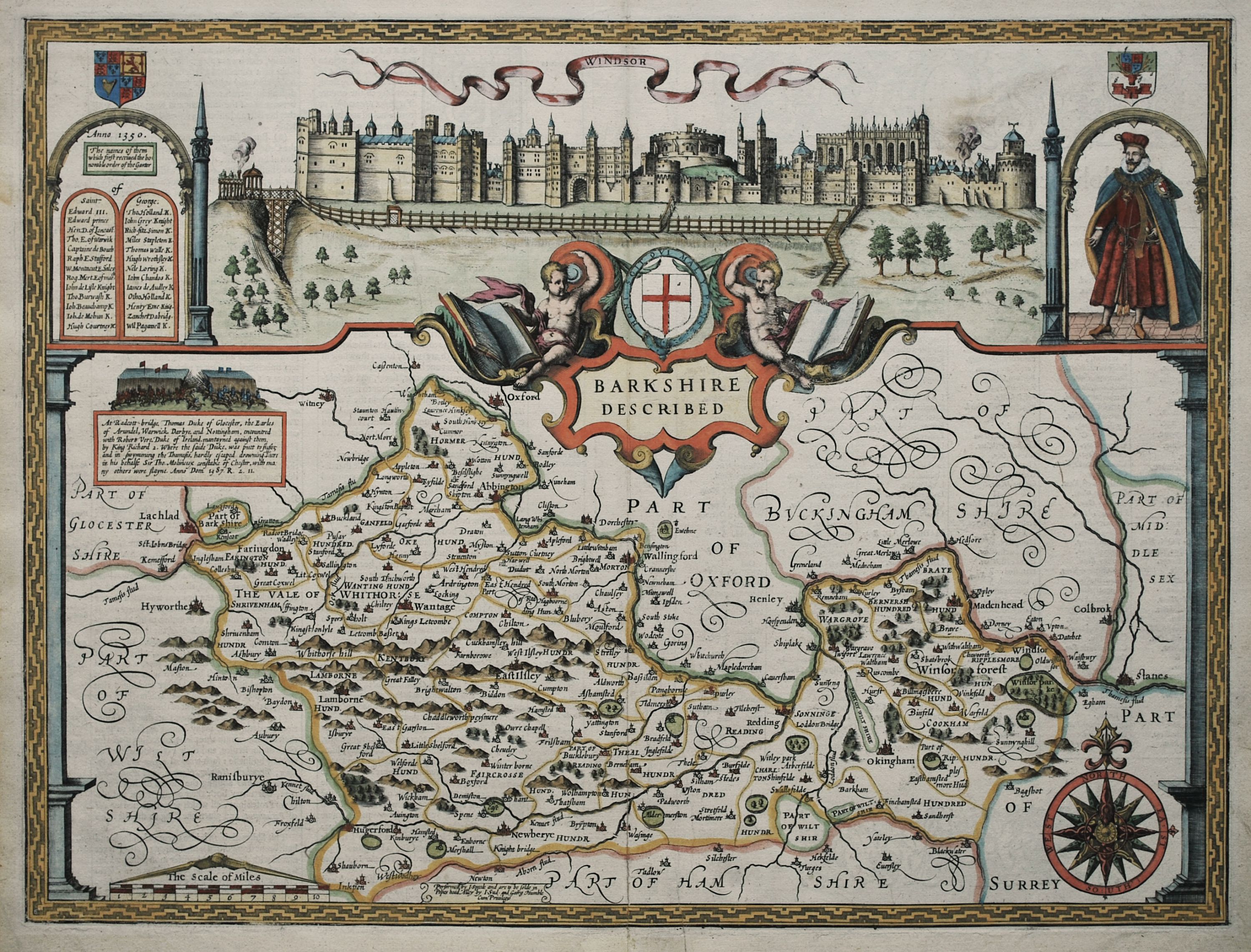 Coloured map of Berkshire from the first Sudbury & Humble edition of John Speed’s “Theatre of the Empire of Great Britain”. The top of the map shows a panoramic view of Windsor castle as viewed from the Thames, which is flanked on the left with a cartouche indicating the names of members of the Honourable Order of the Garter and on the right by a Knight of the Garter. The map is further decorated with a description of a battle of Radcot Bridge that took place at in 1387, a compass rose and a title cartouche displaying the English Cross of St. George and surrounded by two putti. A description of the county appears on the verso in English. Other than repairs to a bottom centrefold split and adjacent tear, the map is a beautifully coloured example on heavy, stable paper with full margins in excellent condition. 38 cm x 51 cm