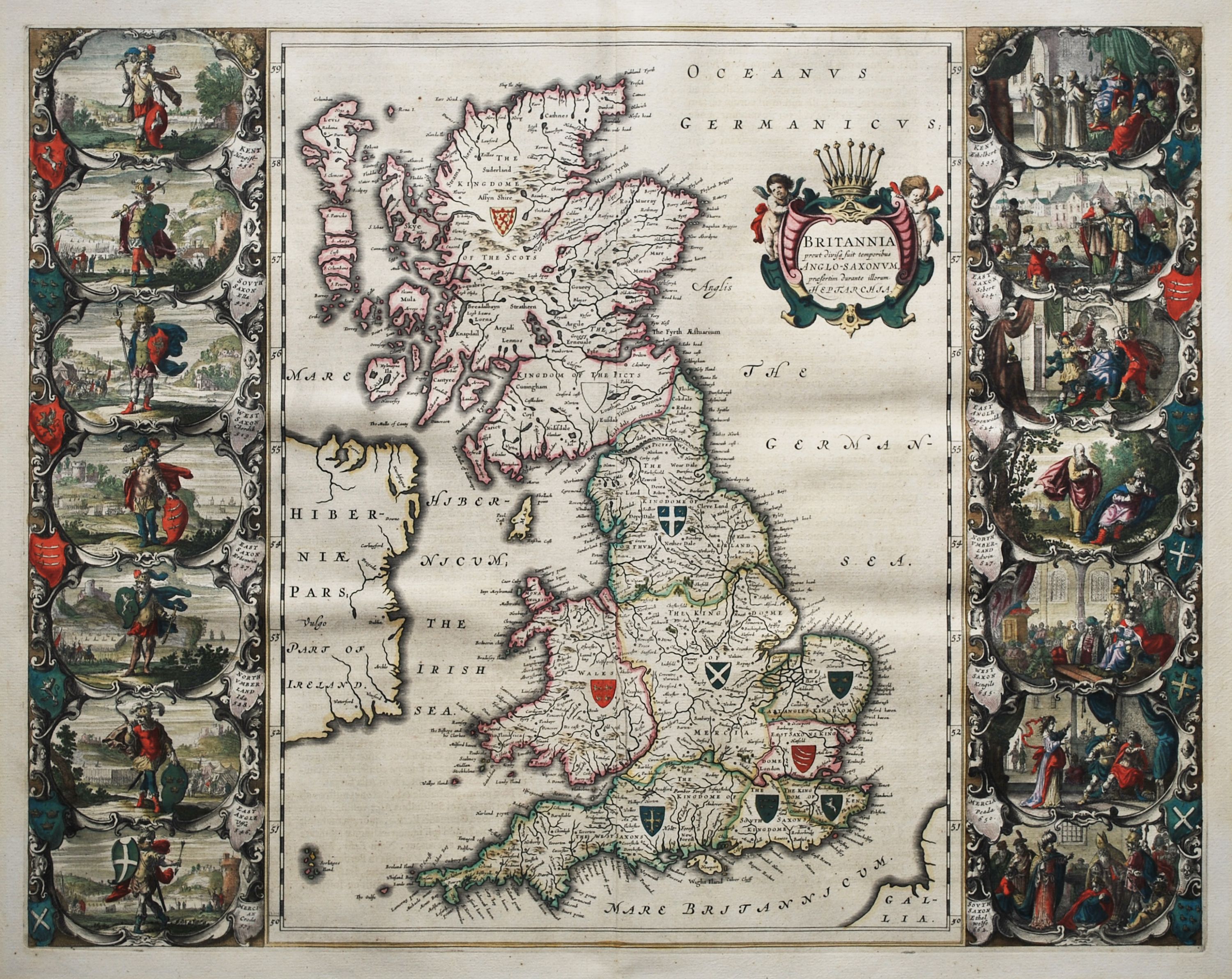 Coloured map of the British Isles taken from Blaeu’s grand atlas of the world “Atlas Novus”. Volume IV first published in 1645. This map, which is generally considered to be one of the finest maps of the 17th century, shows Britain as it was divided under the Saxon kings. Done as miniatures in the style of contemporary Dutch painters, the 14 vignettes on either side of the map show ancient Saxon kings and their conversion to Christianity. The map is based on the Speed example, first published in 1611, but is considered to be superior to the original. A description of the Saxon Kingdoms appears verso in Latin. Superb old coloured example in excellent condition. 41 cm x 52.5 cm