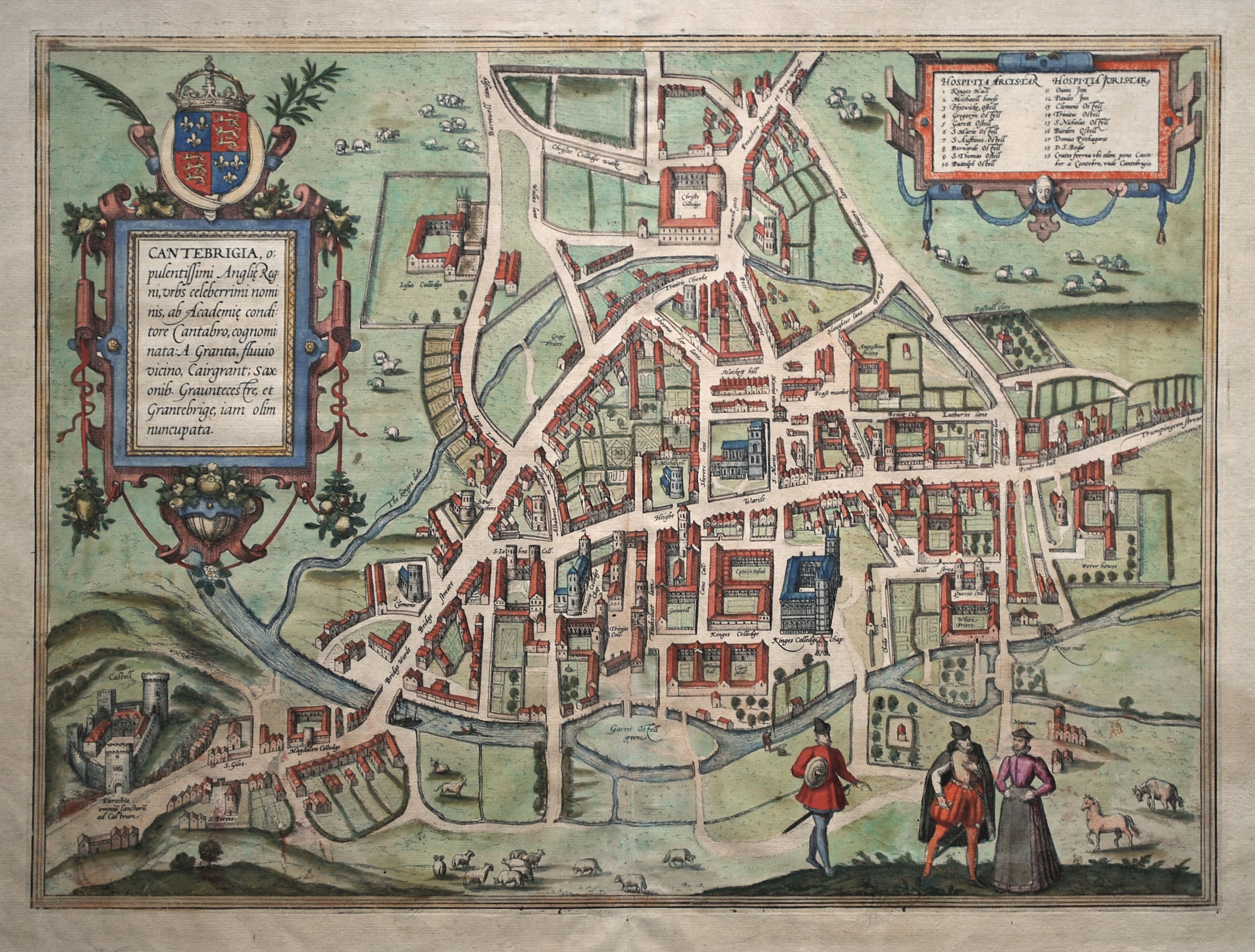 Old coloured town plan of Cambridge from the landmark Braun & Hogenberg atlas of cities throughout the world entitled “Civitates Orbis Terrarum” first published in 1572. The plan, initially appearing in 1575, shows details of 16th century Cambridge from a birds-eye perspective including its colleges, castle and local residents in period clothing. A key is included in the top right that identifies 19 important places and buildings shows their location. A description of the town appears verso in Latin. Other than some professionally repaired minor cracking related to the use of verdigris, a lovely old coloured example in excellent condition. 33 cm x 44.5 cm