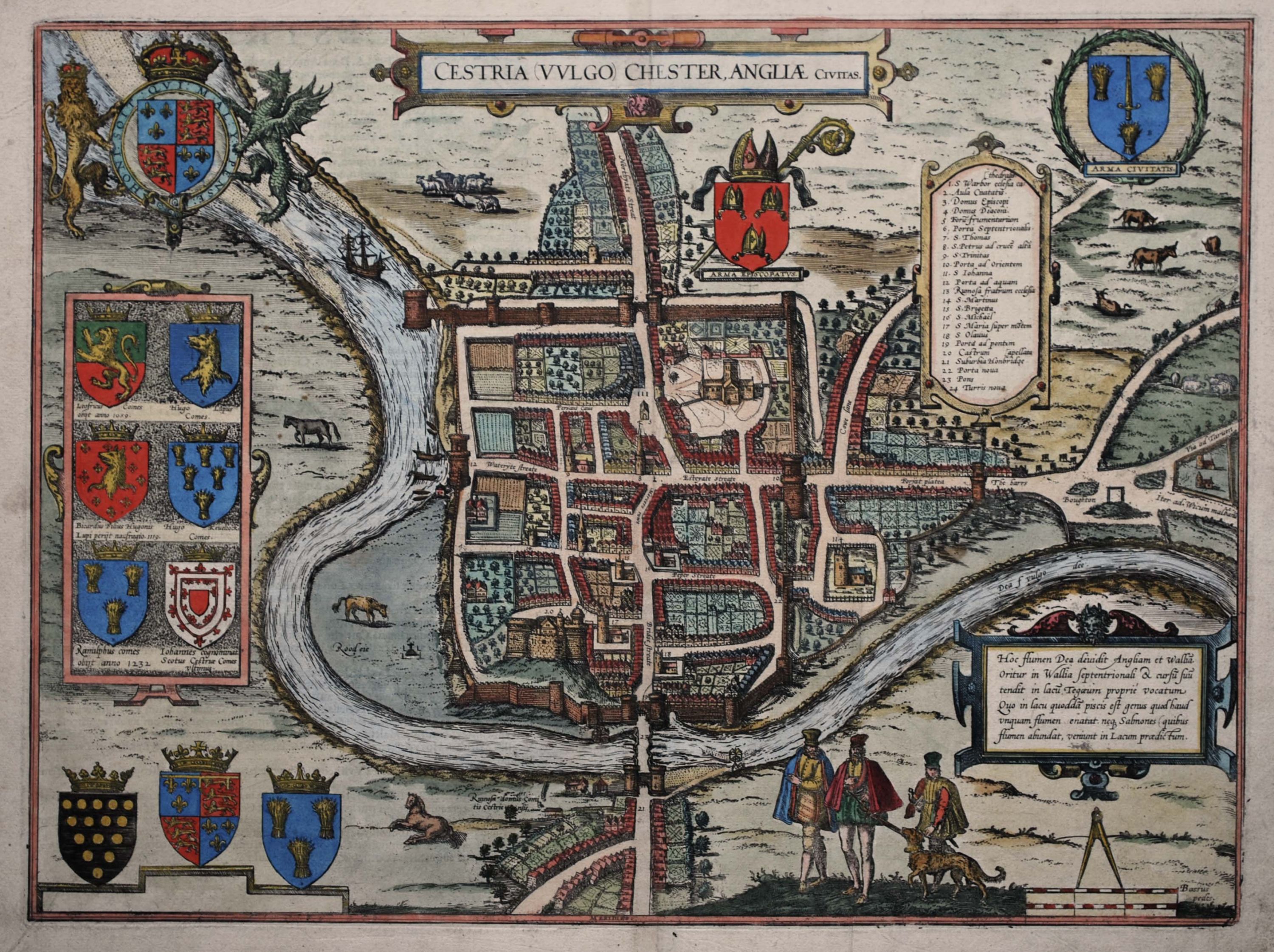 Finely coloured town plan of Chester from the landmark Braun & Hogenberg atlas of cities throughout the world entitled “Civitates Orbis Terrarum” first published in 1572. The plan, initially appearing in 1581, shows details of 16th century Chester including its protective walls, churches, coats of arms of the city and local nobles and residents in period clothing. A description of the town appears verso in Latin. There are some defects to its wide margins and one or two spots; otherwise a strong dark impression in very good condition. 32.5 cm x 43.5 cm