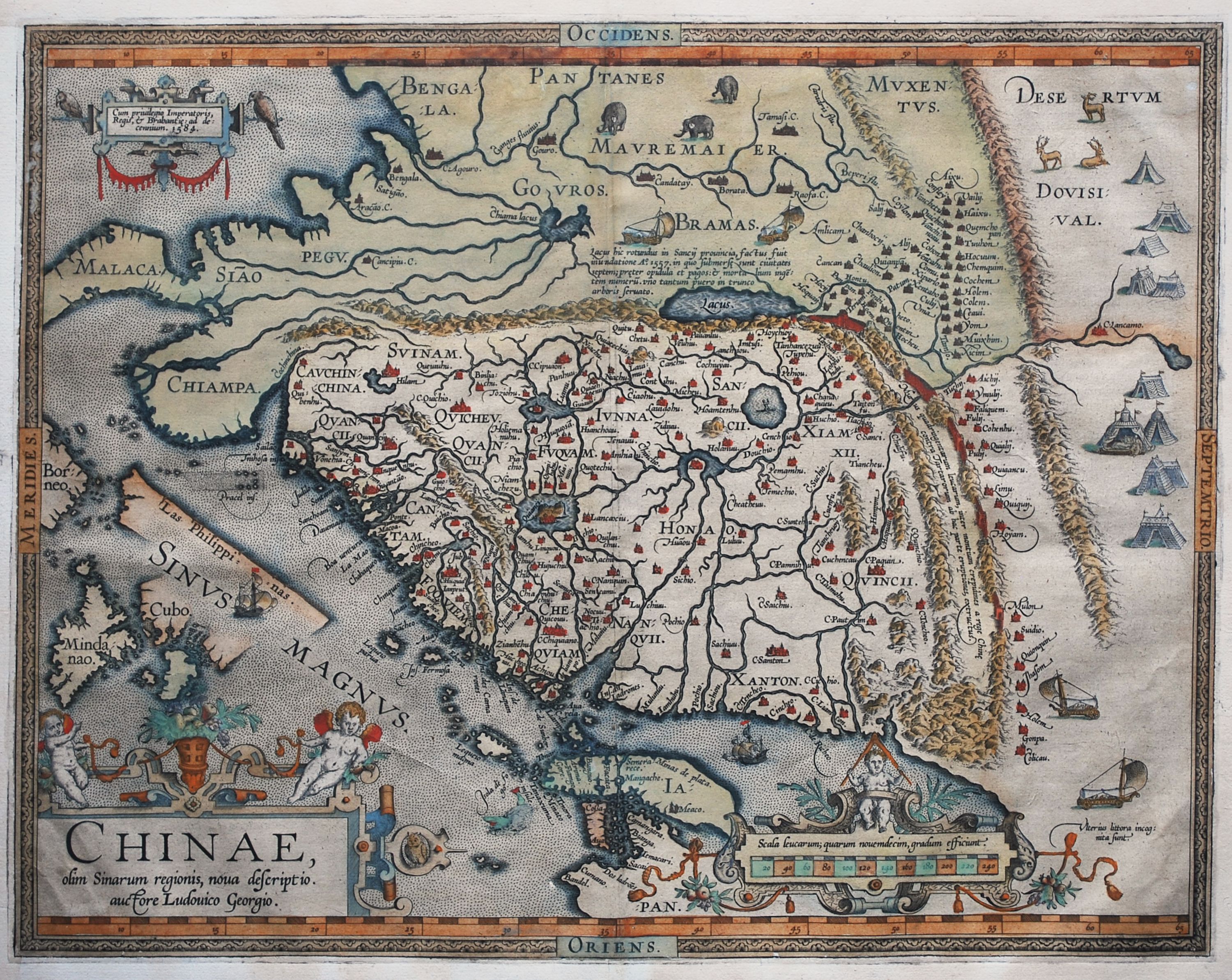 Coloured map of China from the 1608/1612 Italian edition of Abraham Ortelius’ landmark atlas “Theatrum Orbis Terrarum”, the first modern atlas of the world. This map, which was first included in the Ortelius atlas in 1584, is based on a manuscript map by Luis Jorge de Barbuda (Ludovicus Georgius), a Portugese Jesuit cartographer. Unusually oriented to the west, the region covered by the map includes China, Japan, Indo-China, Tartaria and the Philippines. The map, which includes illustrations of wind wagons and Tartar encampments, also shows Great Wall China’s northern border, but its length has been significantly underestimated. A description of China appears on the verso in Italian. The map itself is in excellent condition but its margins have been restored with some losses to the outside neat-line; otherwise a superb, beautifully old-coloured example. 36.5 cm x 47 cm