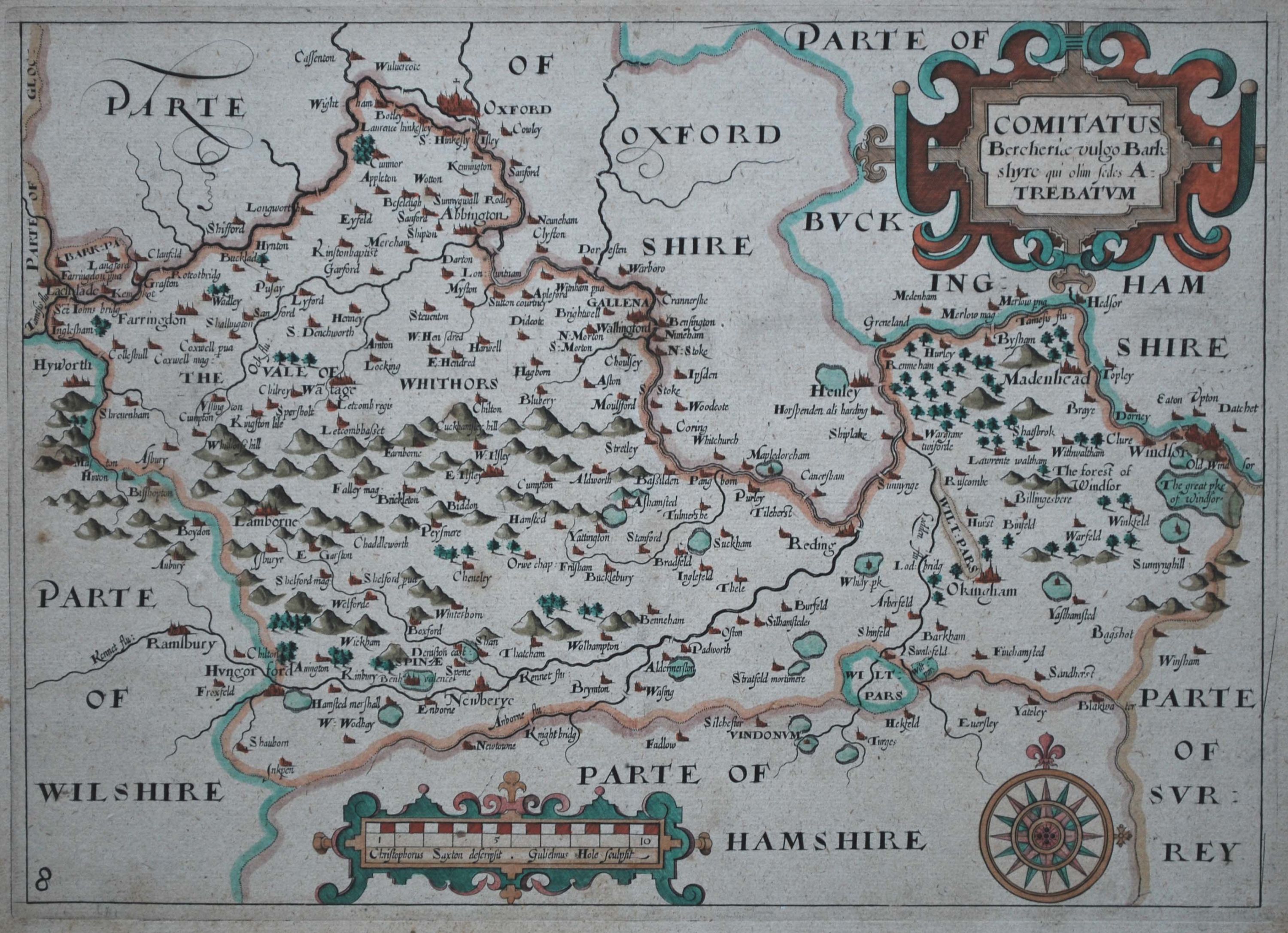 Coloured state 3 map of Berkshire from the 1637 English edition of Camden’s Britannia. Initially issued in 1607, Britannia was the first publication that contained a complete set of individual county maps of England and Wales. The county maps in Britannia were based on the work of Christopher Saxton and John Norden and were engraved by William Hole and William Kip. Blank verso. A finely coloured example in excellent condition. 23 cm x 32 cm