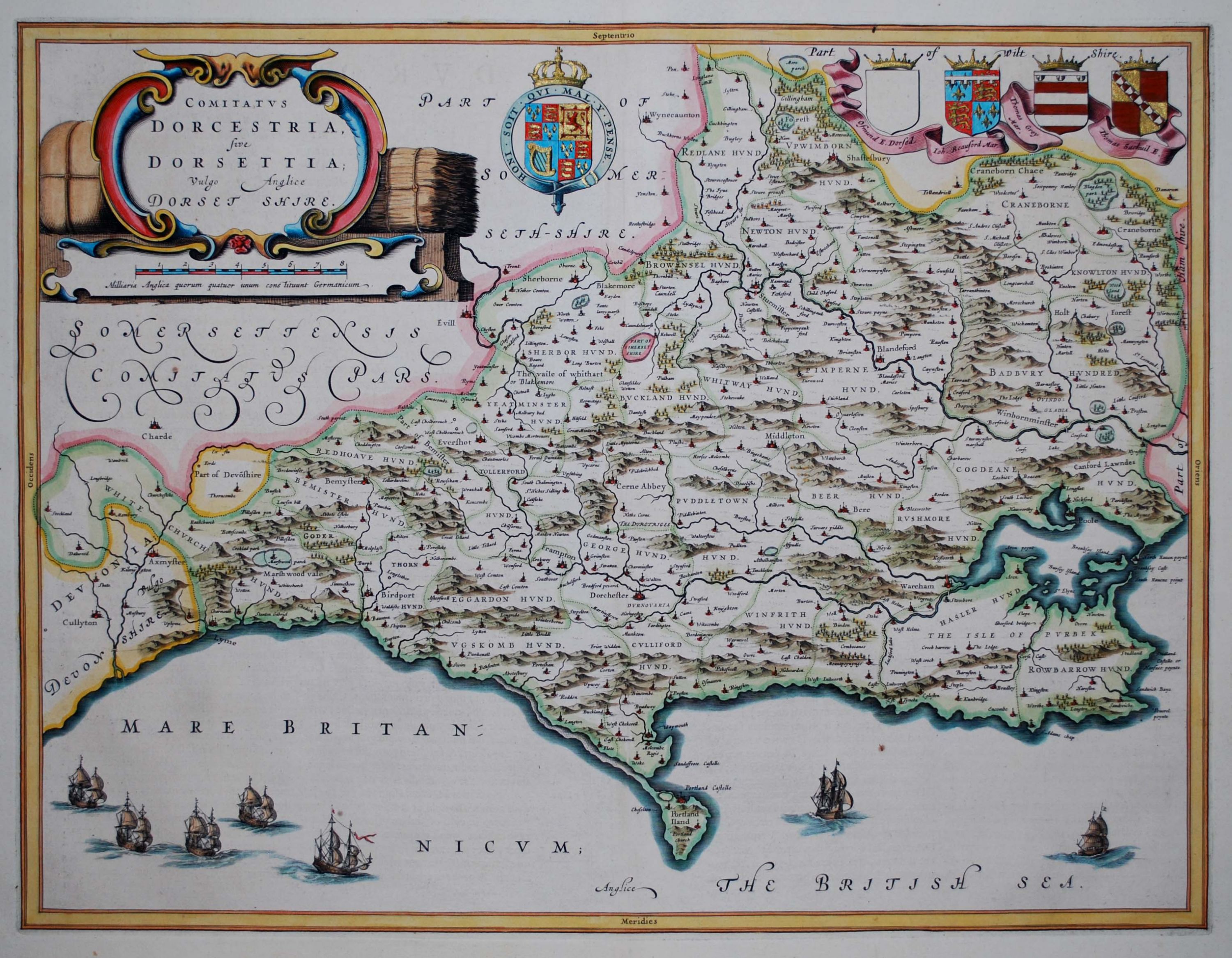Coloured map of Dorsetshire from Volume IV, containing the English county maps, of Blaeu’s landmark atlas of the world “Atlas Novus”, first published in 1645. The map contains the usual Blaeu decorations; including the royal coat of arms together with those of the noble families of the county and scenes of local life. A description of the county appears verso in Latin. Other than some discolouration to the top margin well away from the image; a gold-heightened, finely coloured, strong dark impression in excellent condition. 38 cm x 50 cm