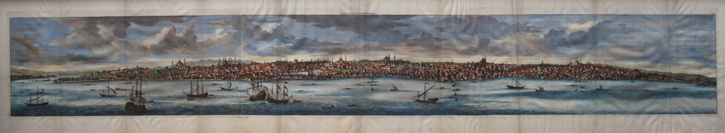 Spectacular panorama of Constantinople from de Bruyn’s 1698 travelogue of the Levent entitled “Reizen door de vermaardste Deelen van Klein Asia”. This panorama of what is now modern day Istanbul by de Bruyn, who was a Dutch landscape painter and traveller, was based on drawings done during his travels in the region in the years 1678 to 1685. It is richly decorated showing the Bosphorus with several sailing ships and smaller boats. Important buildings and locations in the city are identified using a numerical key and includes the Topkapi Palace, the Hagia Sophia, the Sultan Ahmet Mosque (popularly known as the Blue Mosque) and the Valide Sultan Mosque (also known as the New Mosque). Blank verso. Other than some soiling at the folds, the map (currently in a frame) is a beautifully, coloured strong, dark impression in excellent condition. 28 cm x 189 cm
