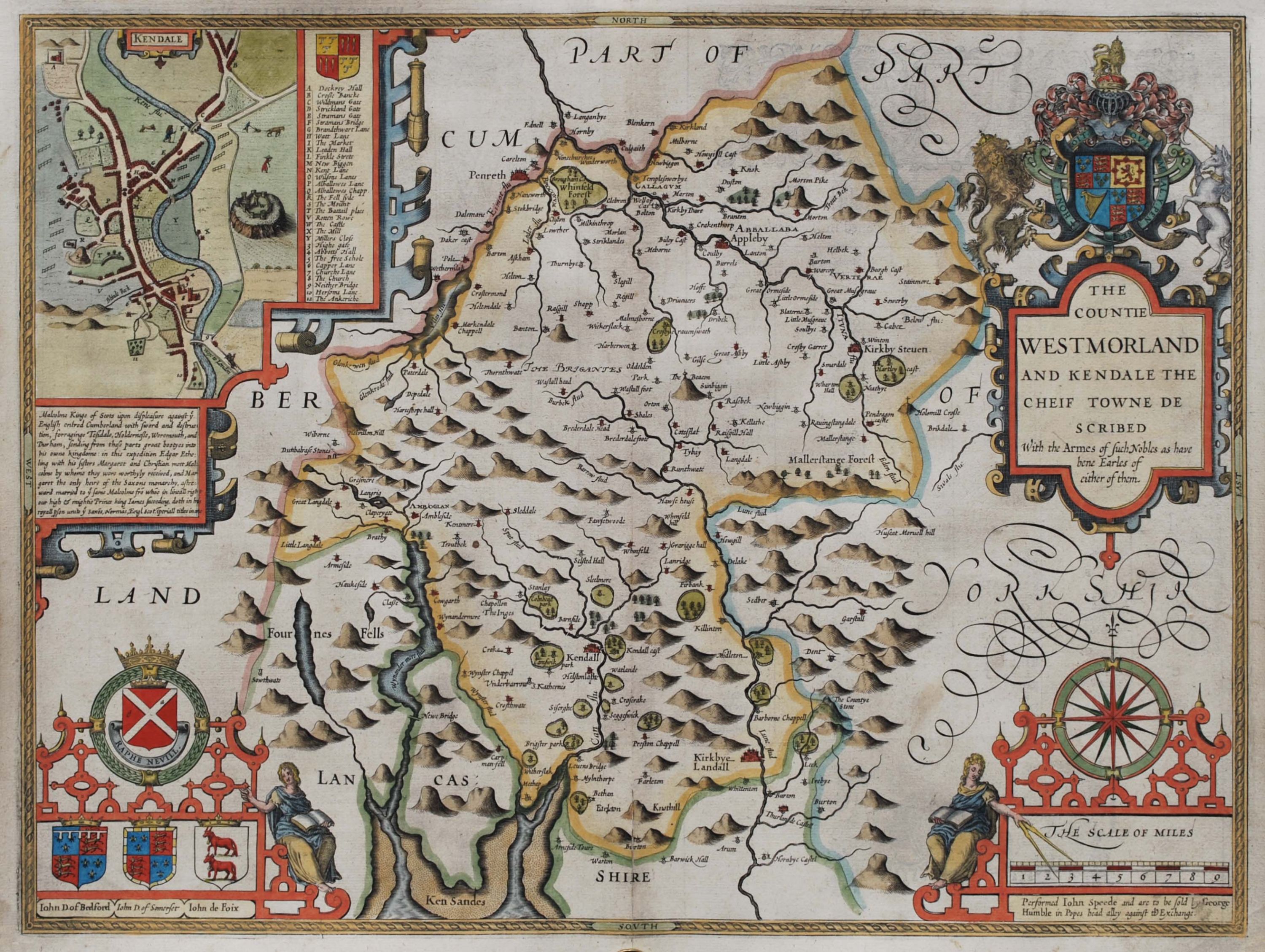 Coloured map of Westmorland from a George Humble edition of John Speed’s “Theatre of the Empire of Great Britain”. A very decorative map of the county, it contains a plan of the town of Kendal along with a key showing places of note. The map is further decorated with two strap-work cartouches, one with the royal coat of arms and the other with the arms of the noble families of the county. A description of the county appears on the verso in English. The map is a finely coloured, strong dark impression in excellent condition. 38 cm x 51 cm