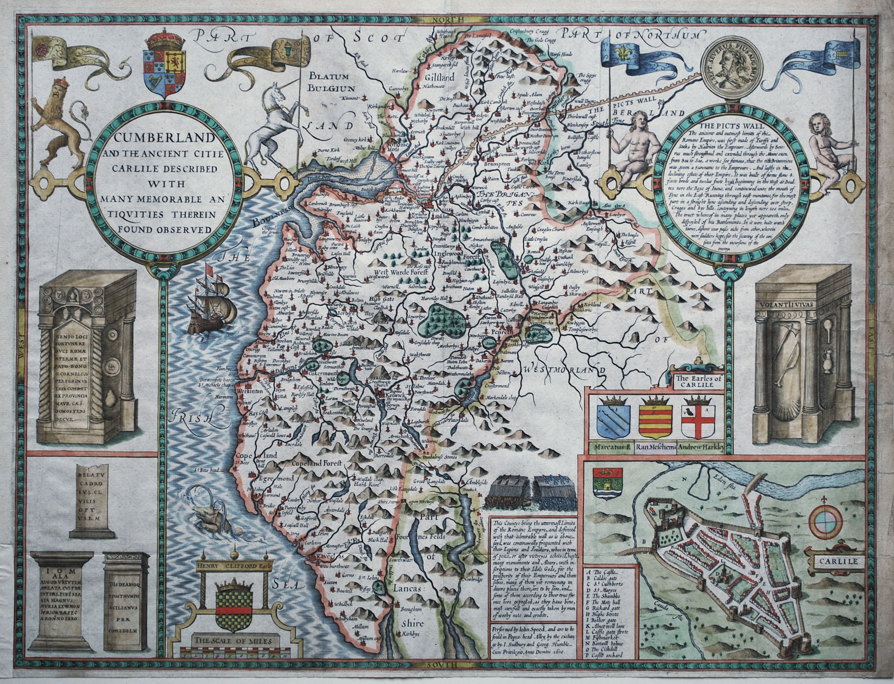 Coloured map of Cumberland as appearing in John Speed’s “Theatre of the Empire of Great Britain”. The map contains a plan of the city of Carlisle along with decorative engravings of Roman antiquities located there. As the verso is blank, this map may have either been issued separately or included in a campaigning atlas during the English Civil War. A strong dark impression, there is some browning on the right side of the map, a close bottom margin and various marginal defects, otherwise a very good, finely coloured example. 38 cm x 50.5 cm