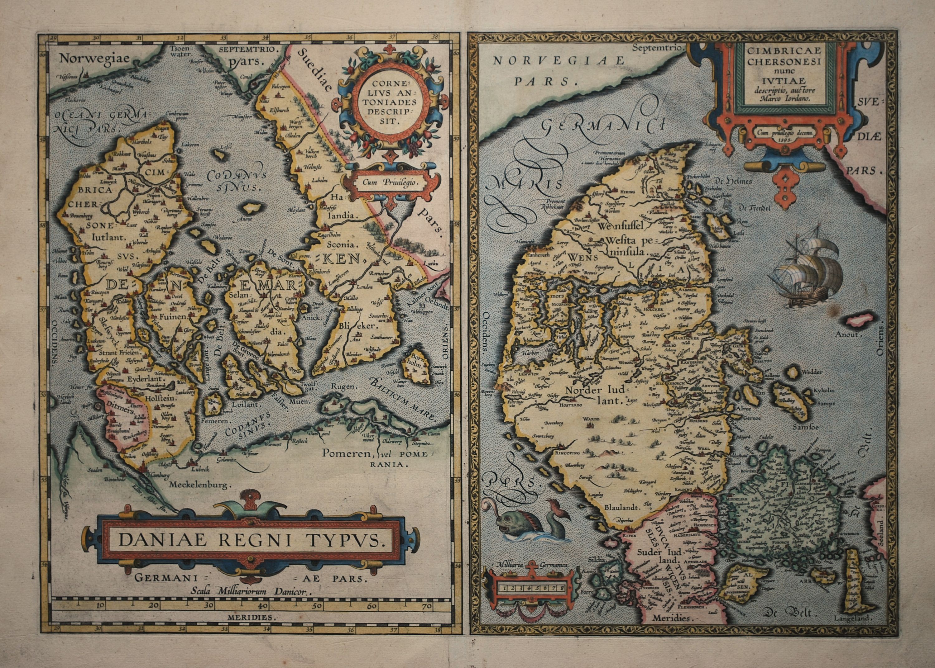 Coloured maps of the kingdom of Denmark and the Jutland peninsula from the 1601 Latin edition of Abraham Ortelius’ landmark atlas “Theatrum Orbis Terrarum”, the first modern atlas of the world. This plate is the third and final version of the region and first appeared in the Ortelius atlas in 1595. The Denmark map, which is based on the work of Heinrich Rantzovius, presents updated information and more detail than shown on previous versions. The Jutland map, which is based on Mark Jorden’s 1585 map of Denmark, shows a detailed view of the peninsula. The maps are decorated with strapwork cartouches, a sea monster and a sailing ship. A description of the region appears on the verso in Latin. Other than a repaired tear in the bottom blank margin near the centrefold, the maps are finely coloured, dark impressions with wide margins in excellent condition. 34 cm x 48.5 cm