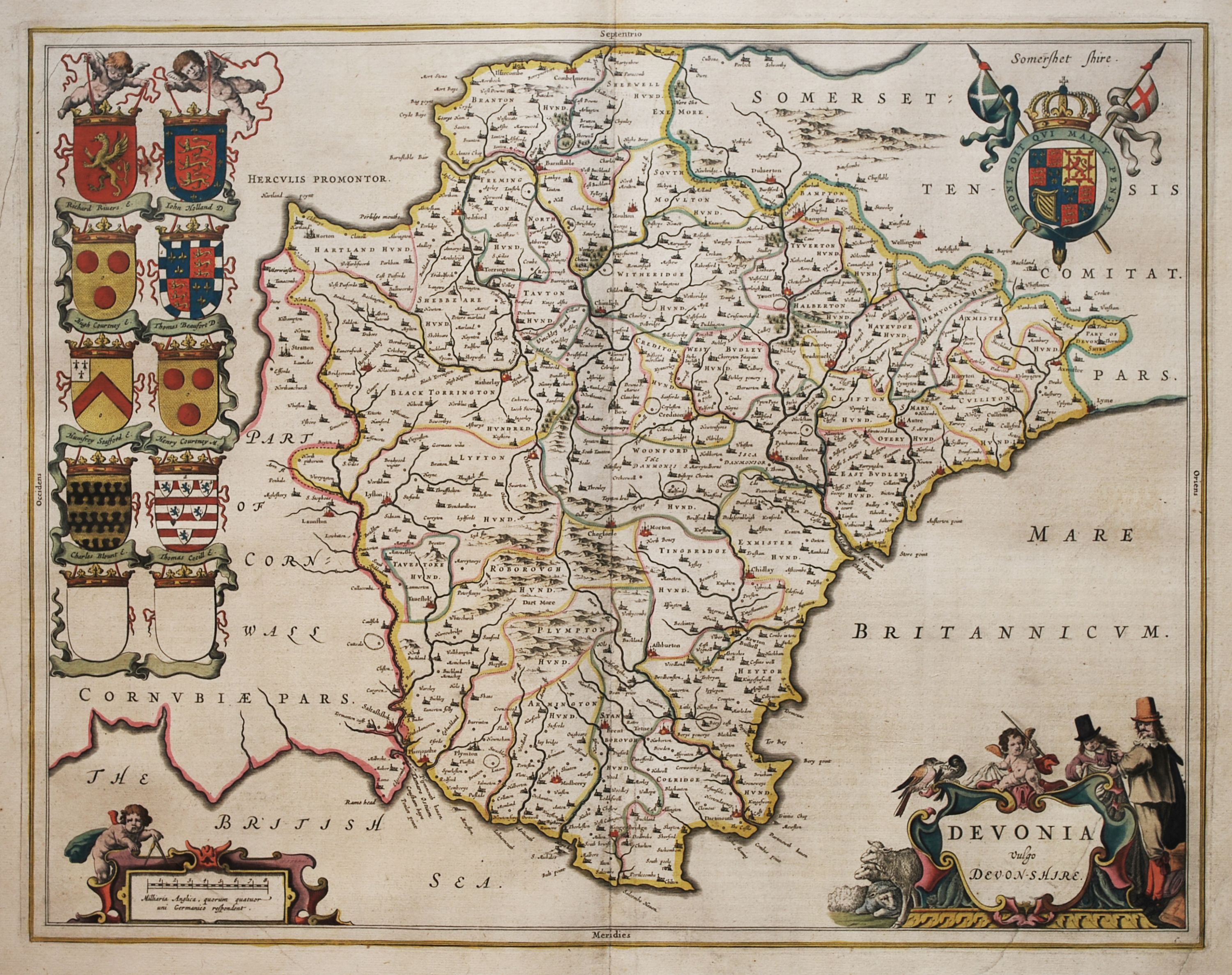 An old coloured county map of Devon from Volume IV, containing the English county maps, of Blaeu’s landmark atlas of the world “Atlas Maior”, first published in 1645. The map contains the usual Blaeu decorations; including the royal coat of arms, several coats of arms of the noble families of the county and a title cartouche surrounded by a putto, two men in period dress and some of the local fauna. A description of the county appears verso in Spanish. Other than some water staining to the extreme bottom corners of the wide margins, a finely old coloured, strong dark impression on heavy paper in excellent condition. 38.5 cm x 50 cm