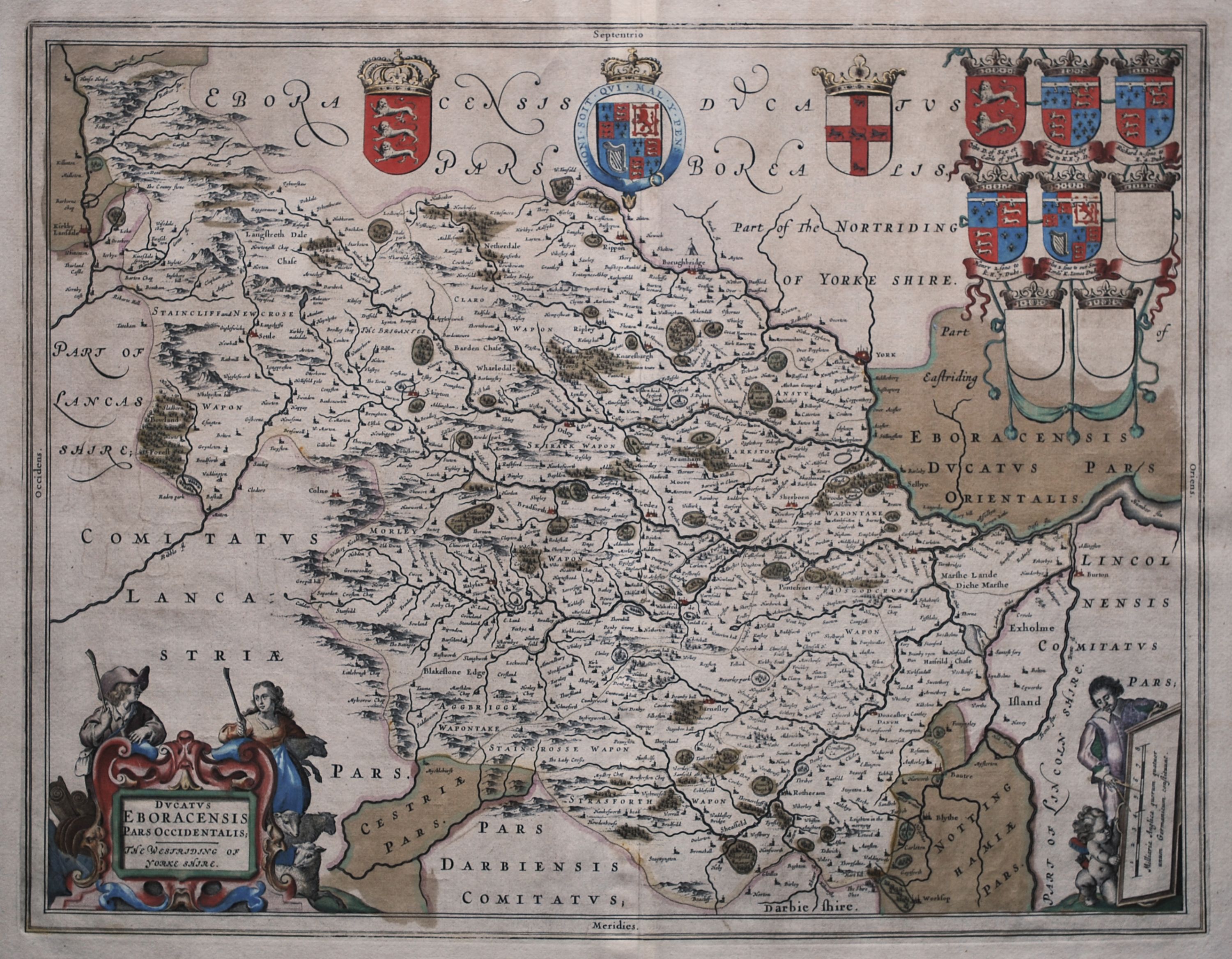 Coloured map of the West Riding of Yorkshire from the rare Spanish edition of Blaeu’s atlas of the world “Atlas Mayor”, Volume V containing the English county maps, first published in 1659. The map contains the usual Blaeu decorations; including the royal coat of arms together with those of the noble families of the county and scenes of local life. A description of the county appears verso in Spanish. The map is age toned, has an area of verdigris strengthened verso and minor marginal defects; otherwise a gold-heightened, finely coloured, strong dark impression in very good condition. 38 cm x 49 cm