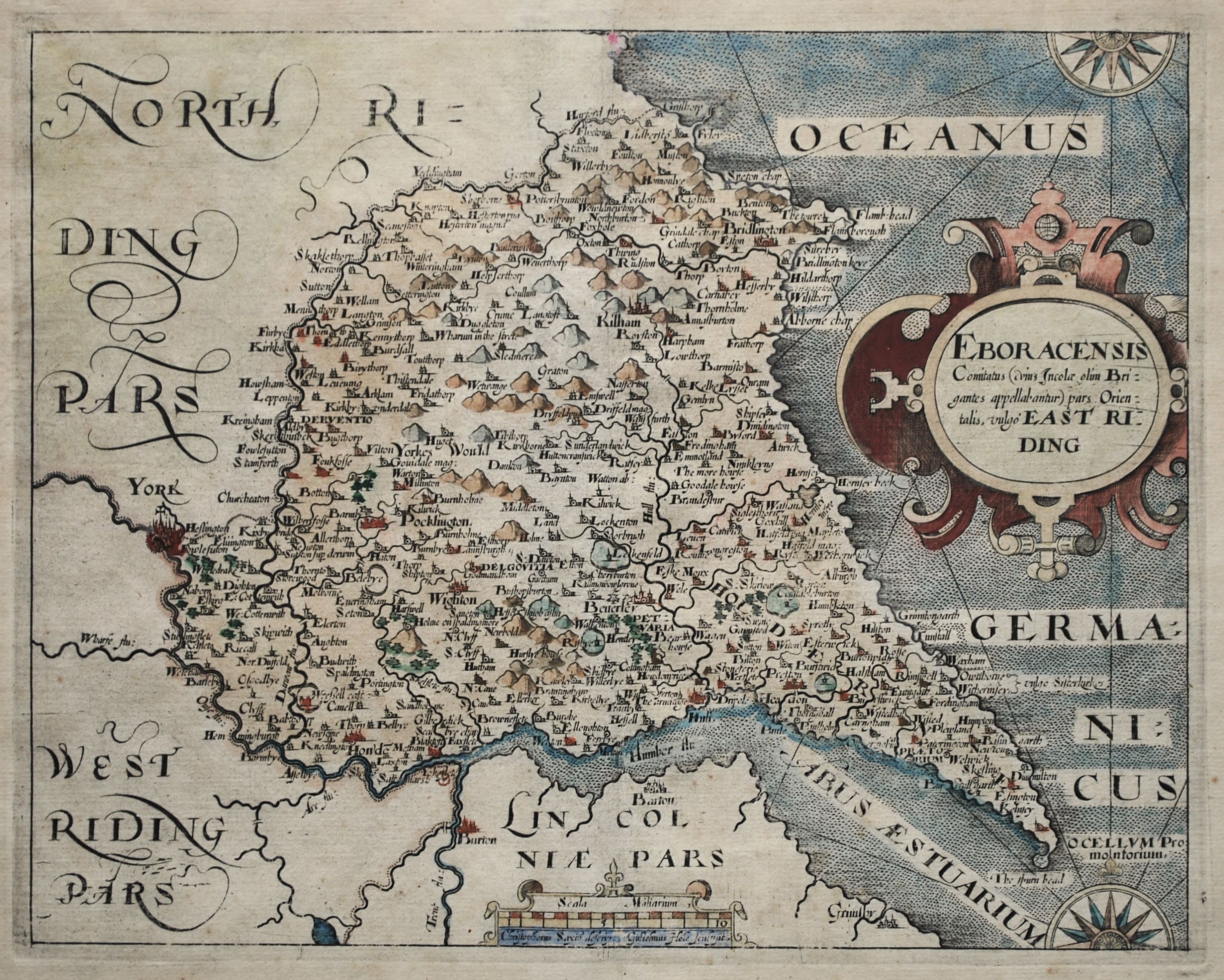 Coloured state 2 map of the East Riding of Yorkshire from the 1610 or 1637 English edition of Camden’s Britannia. Initially issued in 1607, Britannia was the first publication that contained a complete set of individual county maps of England and Wales. The county maps in Britannia were based on the work of Christopher Saxton and John Norden and were engraved by William Hole and William Kip. Blank verso. A finely coloured example with wide margins in excellent condition. 19.5 cm x 24.5 cm