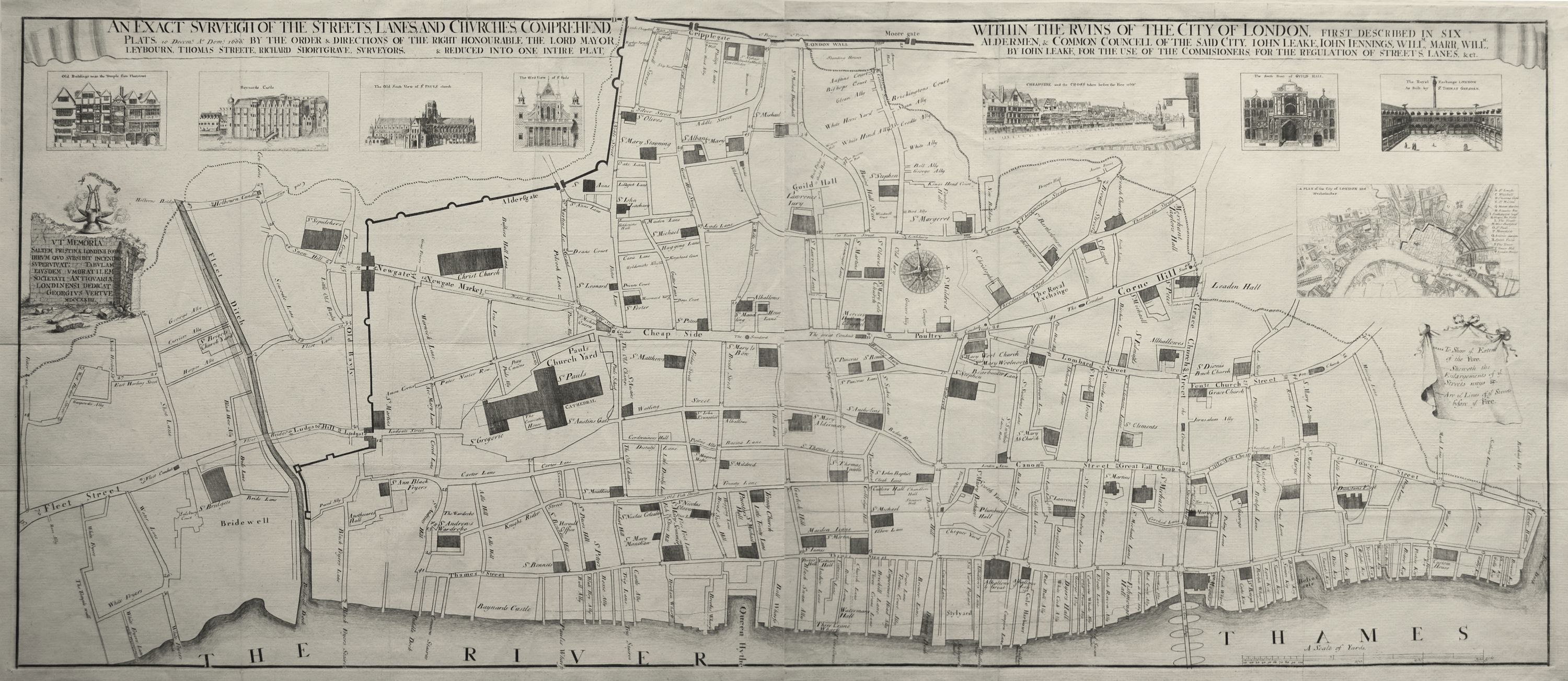 A large, uncoloured post-fire city plan of London on two separate sheets based on John Leake’s 1667 publication that was engraved by Wenceslas Hollar and issued just after the great fire. Engraved by George Vertue and dedicated to the Society of Antiquaries, it shows a detailed view of the city identifying the extent of the great fire and changes to the streets following reconstruction. The plan clearly presents the location of the city’s streets and churches, highlighting the site reserved for the rebuilding of St. Paul’s. The top includes seven views of the city’s buildings including the old St. Paul’s, Guild Hall and Royal Exchange, and at the far right is a plan of London and Westminster with a key identifying 17 important places. Blank verso. Although the plan has its top margin reinstated in what appears to be an old repair with matching paper, both sheets are strong, dark impressions on heavy, stable paper in excellent condition. 53 cm x 63 cm (East sheet) 53 cm x 62 (West sheet).