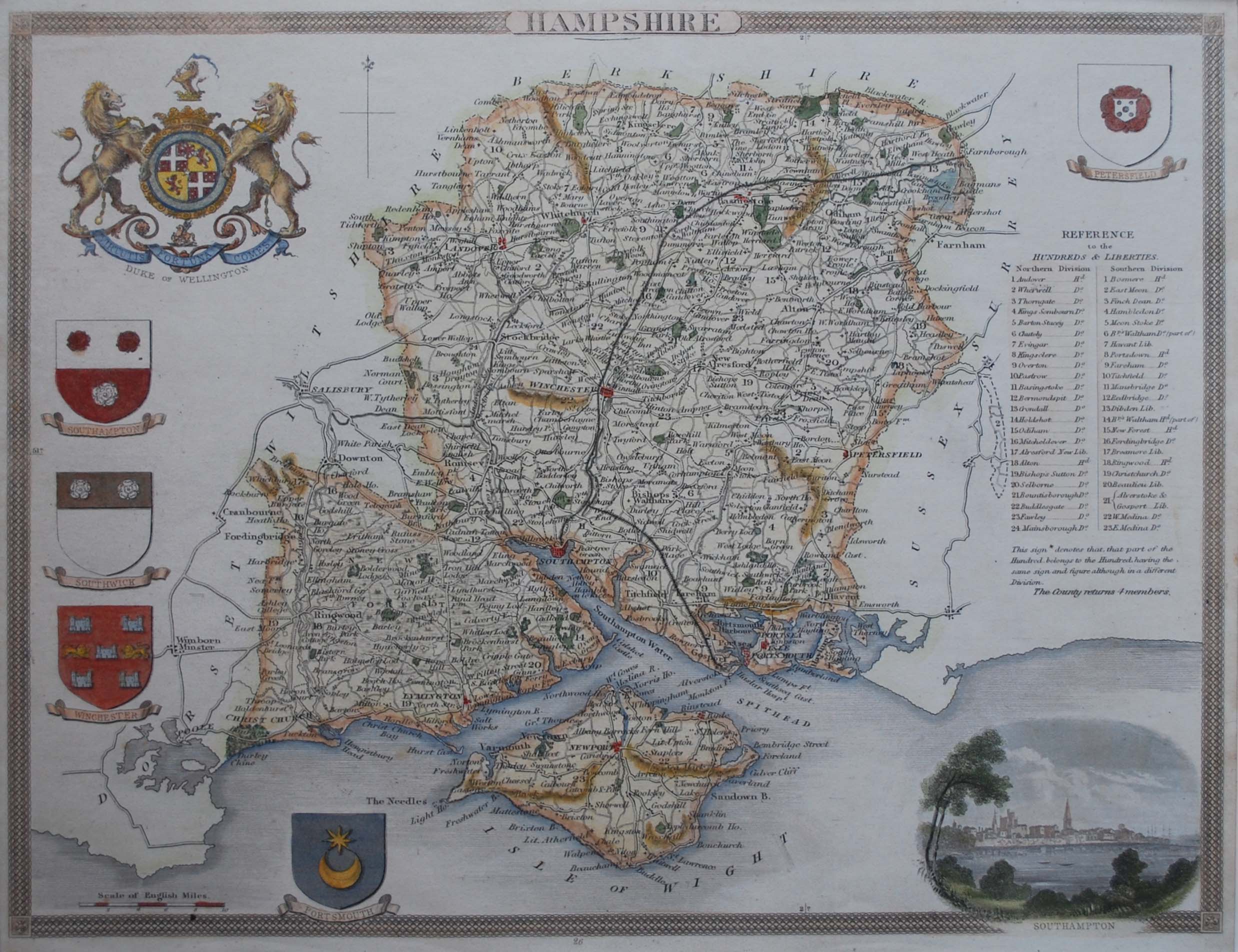 Coloured and finely engraved steel-plate map of Hampshire by Thomas Moule, a scholar and writer on heraldry. Initially issued in 1836, this example was most probably taken from an atlas entitled “Barclays Universal English Dictionary” first published by George Virtue in 1842. Moule’s maps were unusual for the 19th century as most maps published during this period are simply functional reference tools. Considered to be the last series of decorative maps to be issued in England, they are richly decorated with armorials, figures, architectural features and vignettes of local scenes and buildings. Blank verso. The map is in excellent condition. 19.5 cm x 26 cm