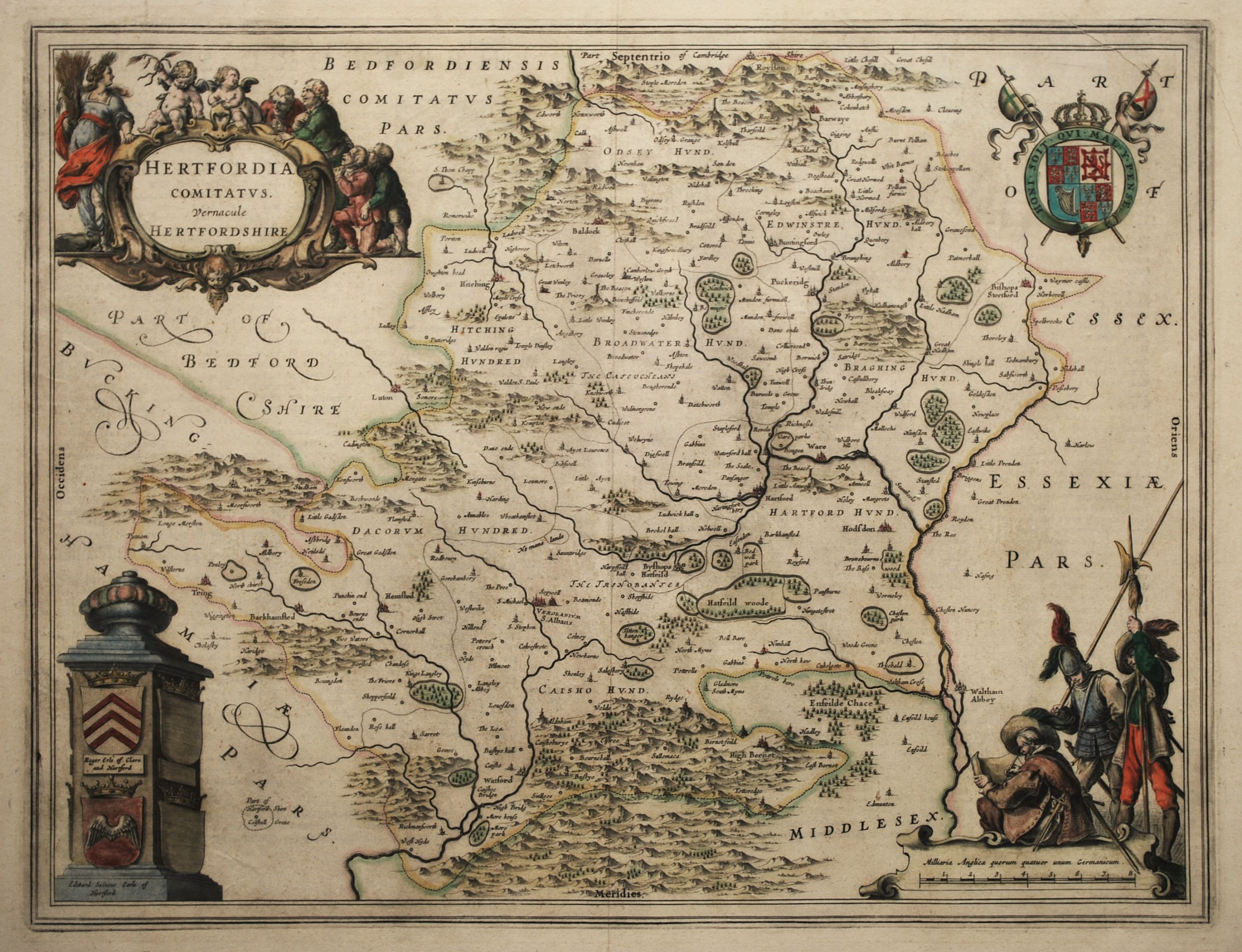 Coloured map of Hertfordshire from Volume IV, containing the English county maps, of Blaeu’s landmark atlas of the world “Atlas Novus”, first published in 1645. The map contains the usual Blaeu decorations; including the royal coat of arms together with those of the noble families of the county and scenes of local life. A description of the county appears verso in Dutch. The map has some professional repairs to areas of weakness and tears in the top margin not affecting the image; otherwise in very good condition. 38.5 cm x 50.5 cm