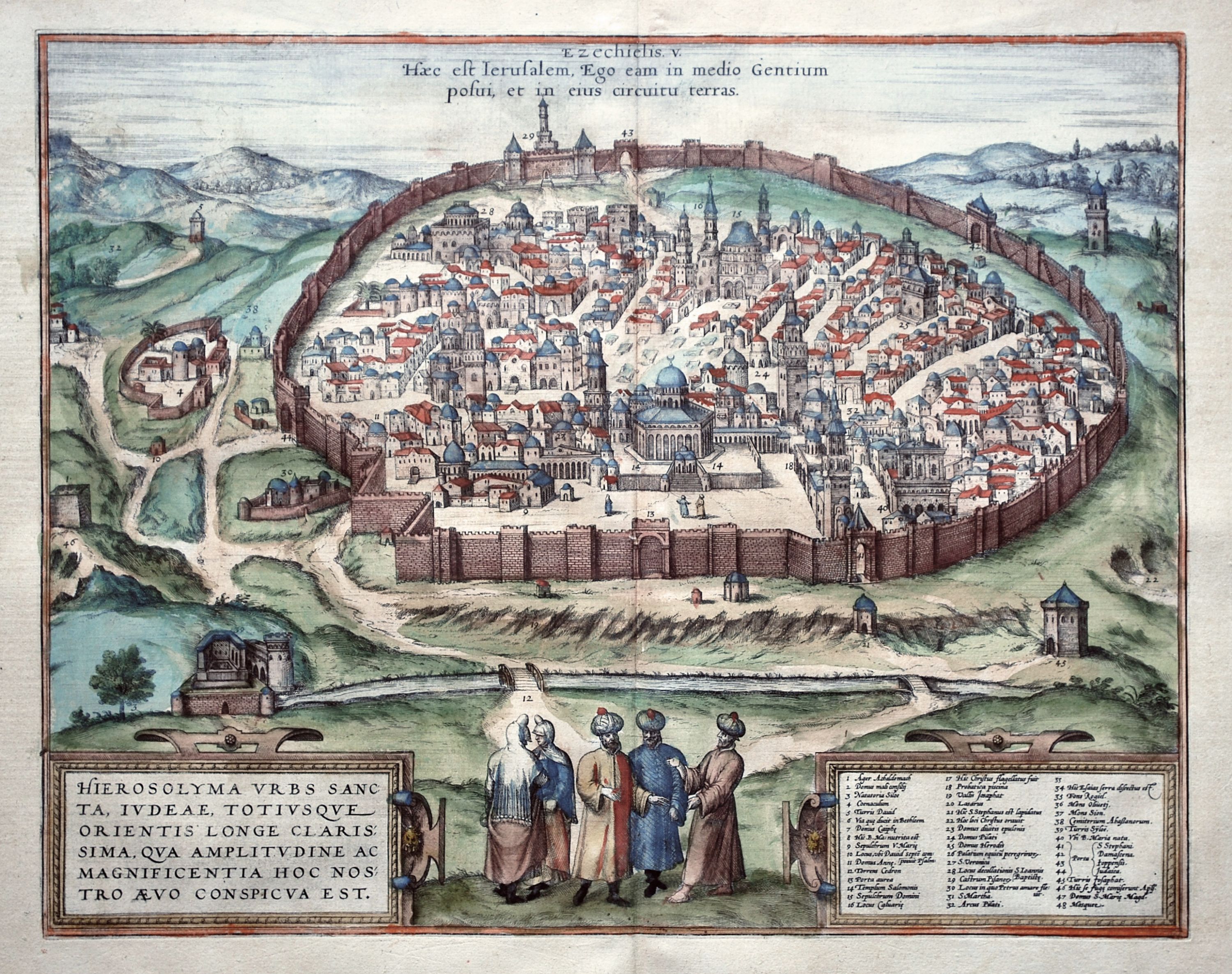 Lovely old coloured plan of Jerusalem from the landmark Braun & Hogenberg atlas of cities throughout the world entitled “Civitates Orbis Terrarum” first published in 1572. The plate, initially appearing in 1575, displays a bird’s-eye view of the city from the east as seen from the Mount of Olives. The image appears to be based on a drawing by Venetian artist Domenico dalle Greche, who made a pilgrimage to the Holy Land in 1546. At the bottom right there is a key that identifies 48 points of interest, the majority of which refer to Christian sites and traditions. At top is a Latin verse from the Prophet Eekiel and, as usual with maps from this atlas; inhabitants of the city are shown at the bottom in period dress. The map, which is a beautifully coloured example with full wide margins, is a strong dark impression on heavy stable paper in excellent condition. 33 cm x 41.5 cm