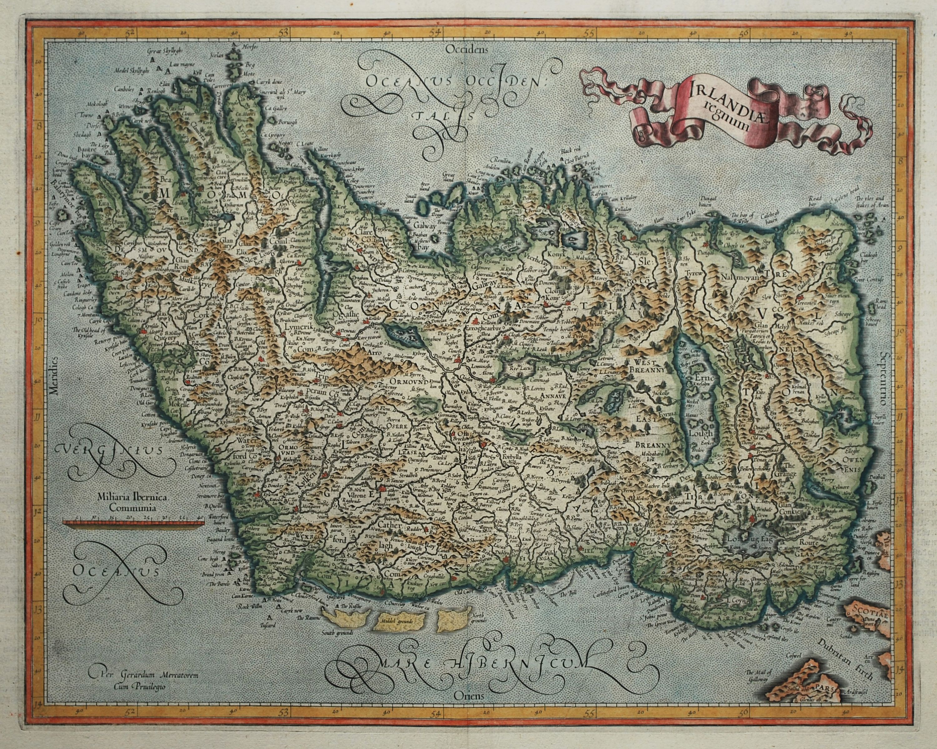 Coloured map of Ireland by Gerard Mercator from a German edition of Henricus Hondius’ reissue of Mercator’s Atlas. Initially published in part III of the Atlas in 1595 one year after Mercator’s death by his son Rumold, it is the first state of the map which still bears the name of Gerard Mercator in the bottom left. As typical with Mercator maps, there is little embellishment other than in the title cartouche with emphasis given to geographical accuracy and detail. As was a common practice in the 16th and early 17th centuries, this charming map shows Ireland oriented to the west. A description of Ireland appears verso in German. A beautifully coloured example of this map with full margins, it is a strong, dark impression on heavy, stable paper in excellent condition. 32.5 cm x 41.5 cm