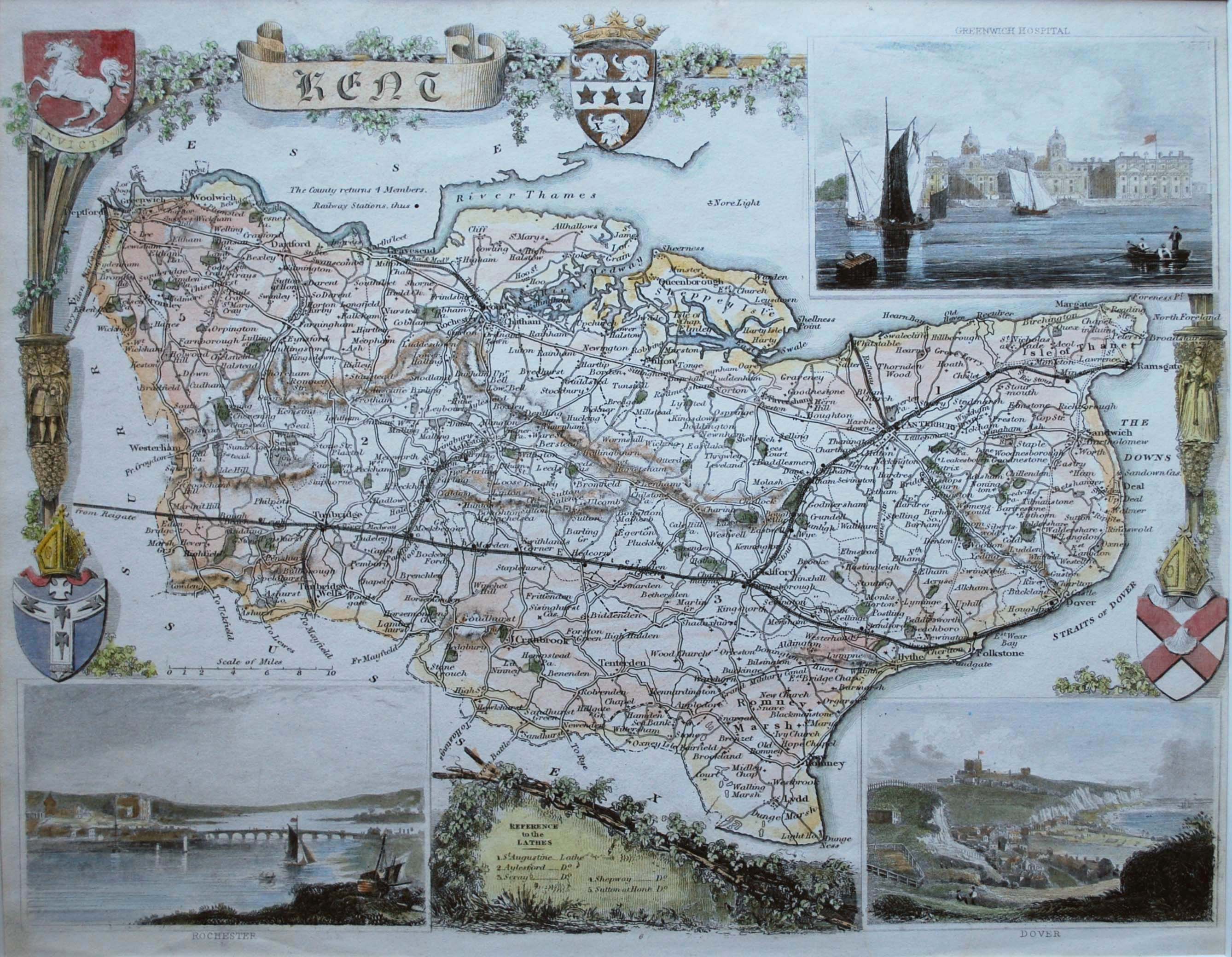 Coloured and finely engraved steel-plate map of Kent by Thomas Moule, a scholar and writer on heraldry. Initially issued in 1836, this example was most probably taken from an atlas entitled “Barclays Universal English Dictionary” first published by George Virtue in 1842. Moule’s maps were unusual for the 19th century as most maps published during this period are simply functional reference tools. Considered to be the last series of decorative maps to be issued in England, they are richly decorated with armorials, figures, architectural features and vignettes of local scenes and buildings. Blank verso. The map is in excellent condition. 19.5 cm x 25.5 cm