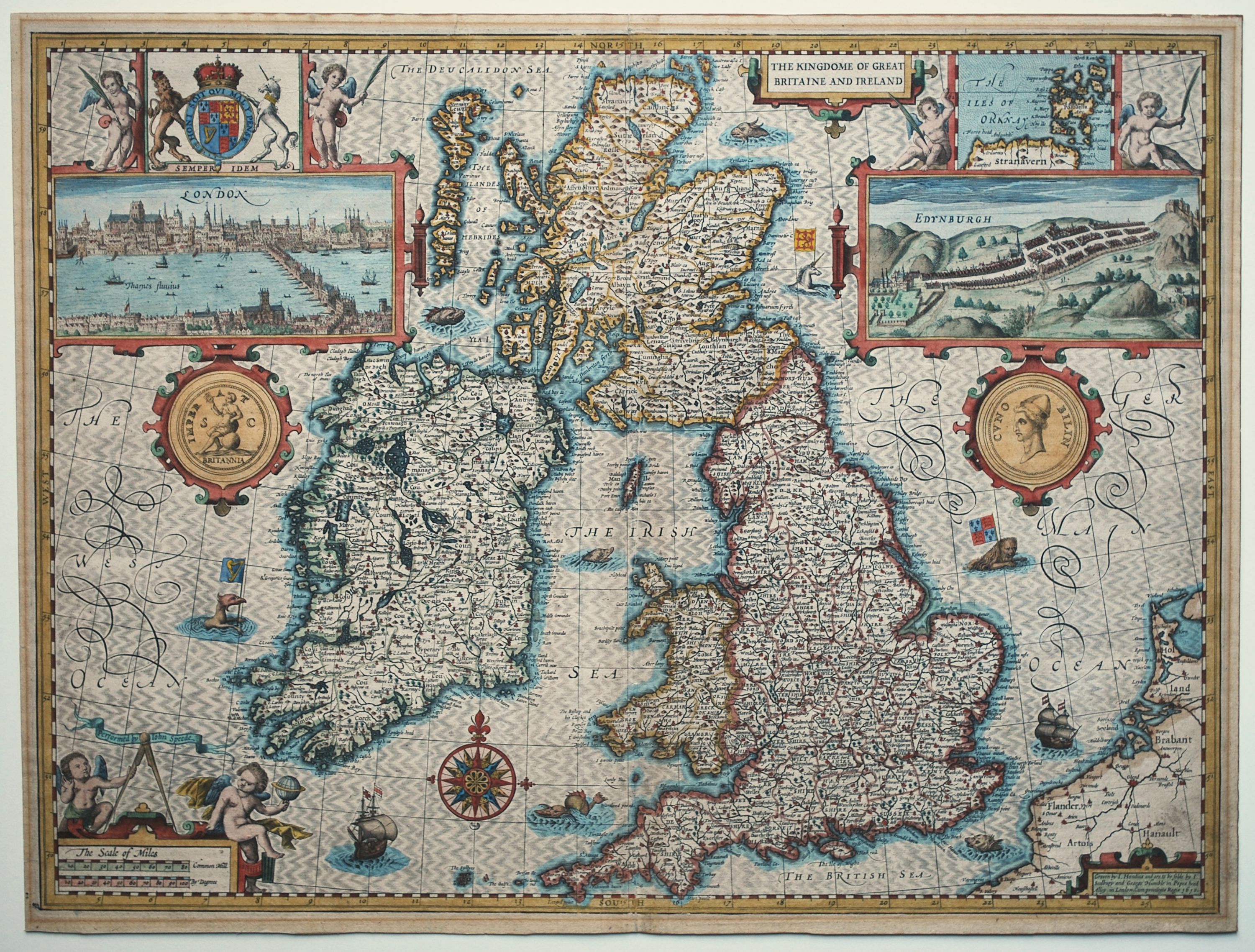 Coloured map of the British Isles from an early ca 1614 edition of John Speed’s “Theatre of the Empire of Great Britain” published by John Sudbury and George Humble. The map served as a general introduction to the series of regional and county maps in the atlas. Engraved by Jodocus Hondius shortly after the union of Scotland with England and Wales, the map contains views of London and Edinburgh celebrating the union. Also shown are numerous vignette illustrations showing ships, sea monsters and coats of arms as well as ancient coins showing Britannia and "Cunobilin", Shakespeare's Cymbeline - King Coel. A description of the British Isles appears on the verso in English. Other than a minor printer’s crease adjacent to the centrefold and a short repair to a bottom centrefold split, a finely coloured, strong impression on heavy, stable paper with tight margins in very good condition. 38 cm x 51.5 cm