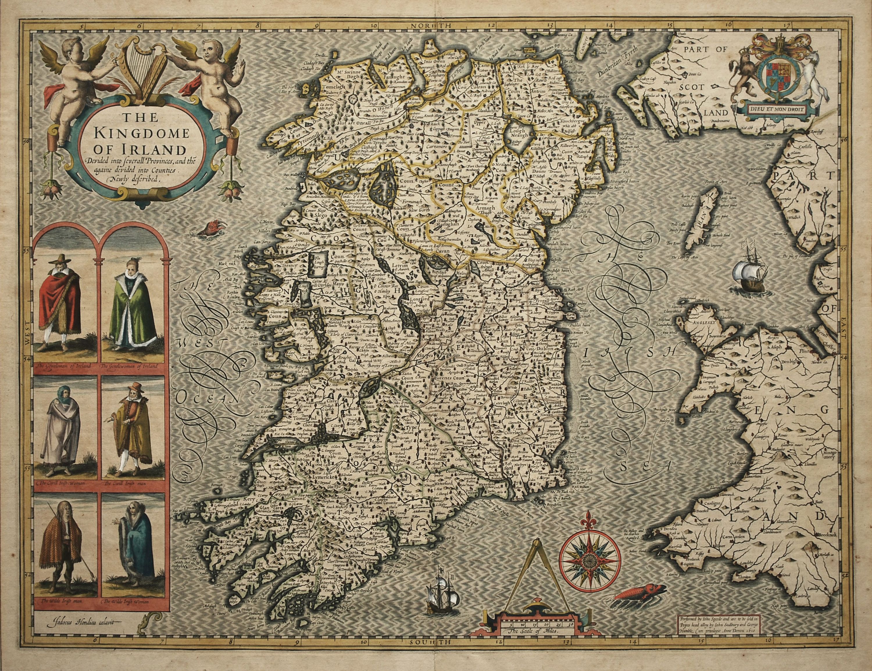 Coloured carte a figures map of Ireland from the first edition of John Speed’s “Theatre of the Empire of Great Britain” published by Sudbury & Humble. Considered to be one of the most decorative and best maps of Ireland of the period, it is based on the 1595 map of Gerard Mercator as well as surveys done by Robert Lythe in the 1570’s and Francis Jobson in the 1590’s. The map, which shows the details of the provinces and counties of Ireland, depicts six period figures of Irish inhabitants including a Gentleman, Gentlewoman, Civill Woman, Civill Man, Wilde Man and Wilde Woman. Other decorative features comprise a compass rose, sea monsters, cherubs, a royal coat of arms and sailing ships. A description of Ireland appears verso in English. Other than some minor repairs to the bottom margin, a beautifully coloured example with good margins on heavy, stable paper in excellent condition. 38.5 cm x 51 cm