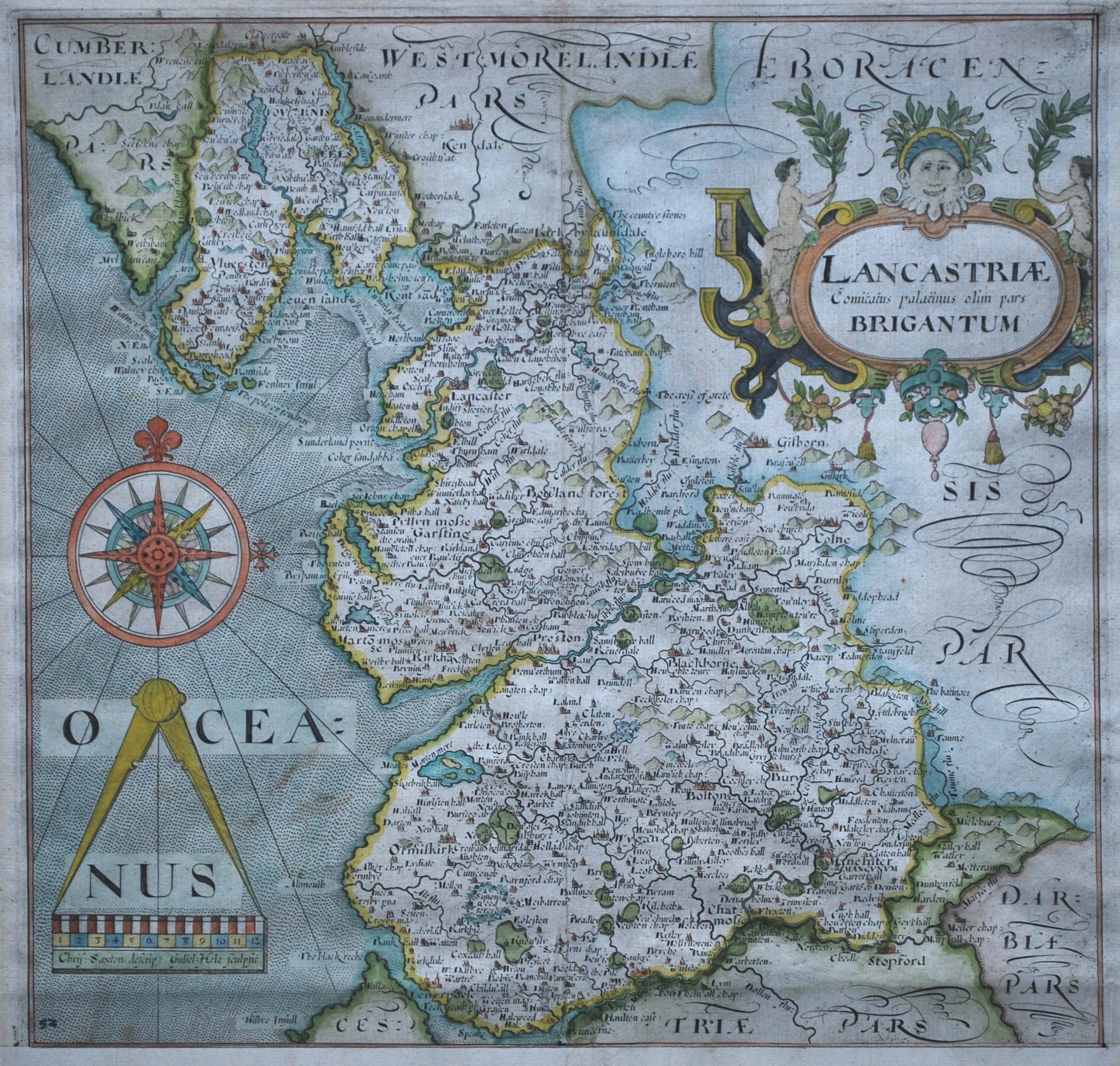 Coloured state 3 map of Lancashire from the 1637 edition of Camden’s Britannia. Initially issued in 1607, Britannia was the first publication that contained a complete set of individual county maps of England and Wales. The county maps in Britannia were based on the work of Christopher Saxton and John Norden and were engraved by William Hole and William Kip. Blank verso. Restored bottom margin without loss and repaired bottom centrefold split; otherwise in very good condition. 29.5 cm x 31 cm