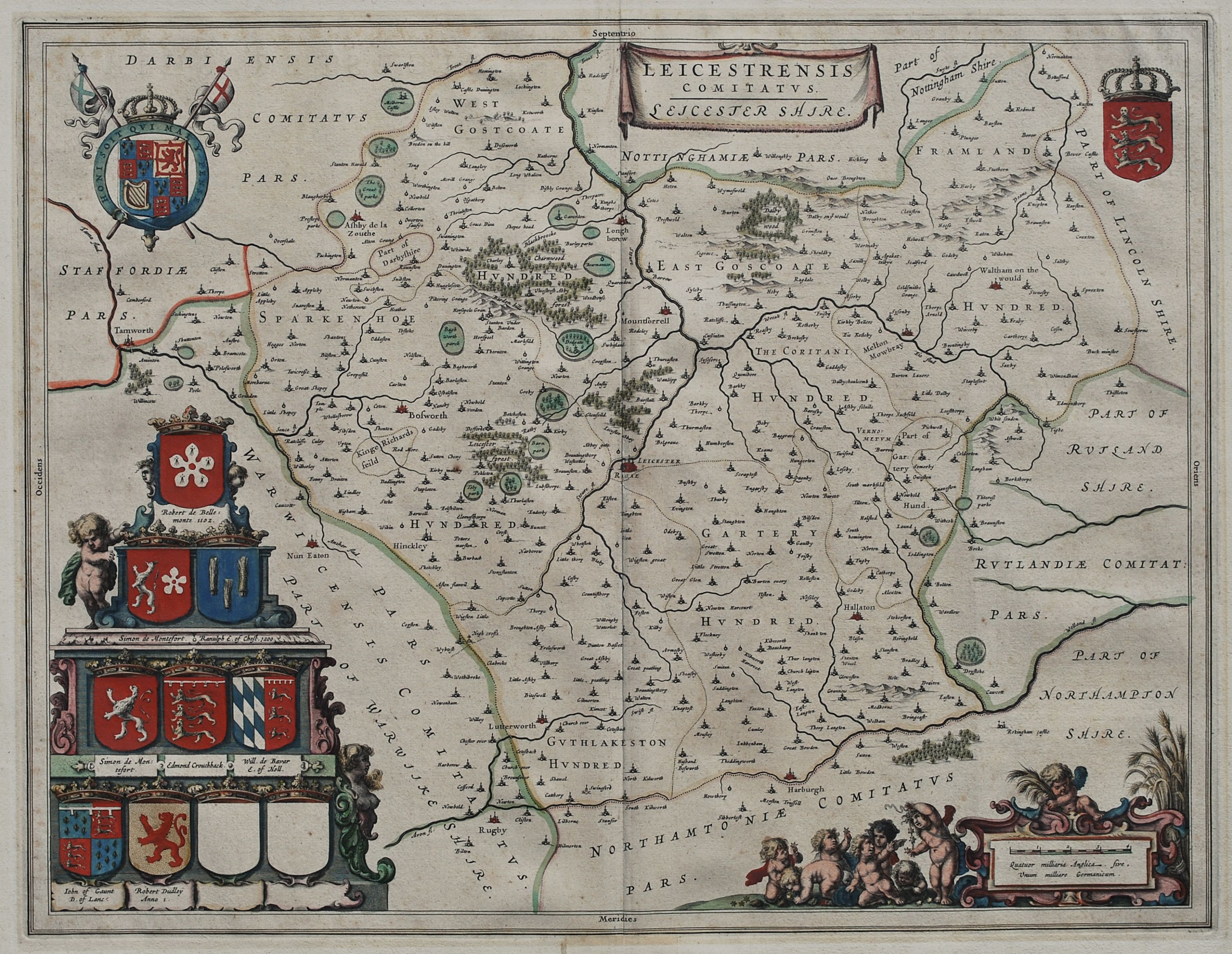An old coloured county map of Leicestershire from Volume IV, containing the English county maps, of Blaeu’s landmark atlas of the world “Atlas Novus”, first published in 1645. The map contains the usual Blaeu decorations; including the royal coat of arms, several coats of arms of the noble families of the county and a title cartouche surrounded by several putti. A description of the county appears verso in French. Other than remnants of a previous framing on the top margin, well away from the image, a beautifully coloured, strong dark impression on heavy paper with wide margins in very good condition. 38 cm x 49.5 cm