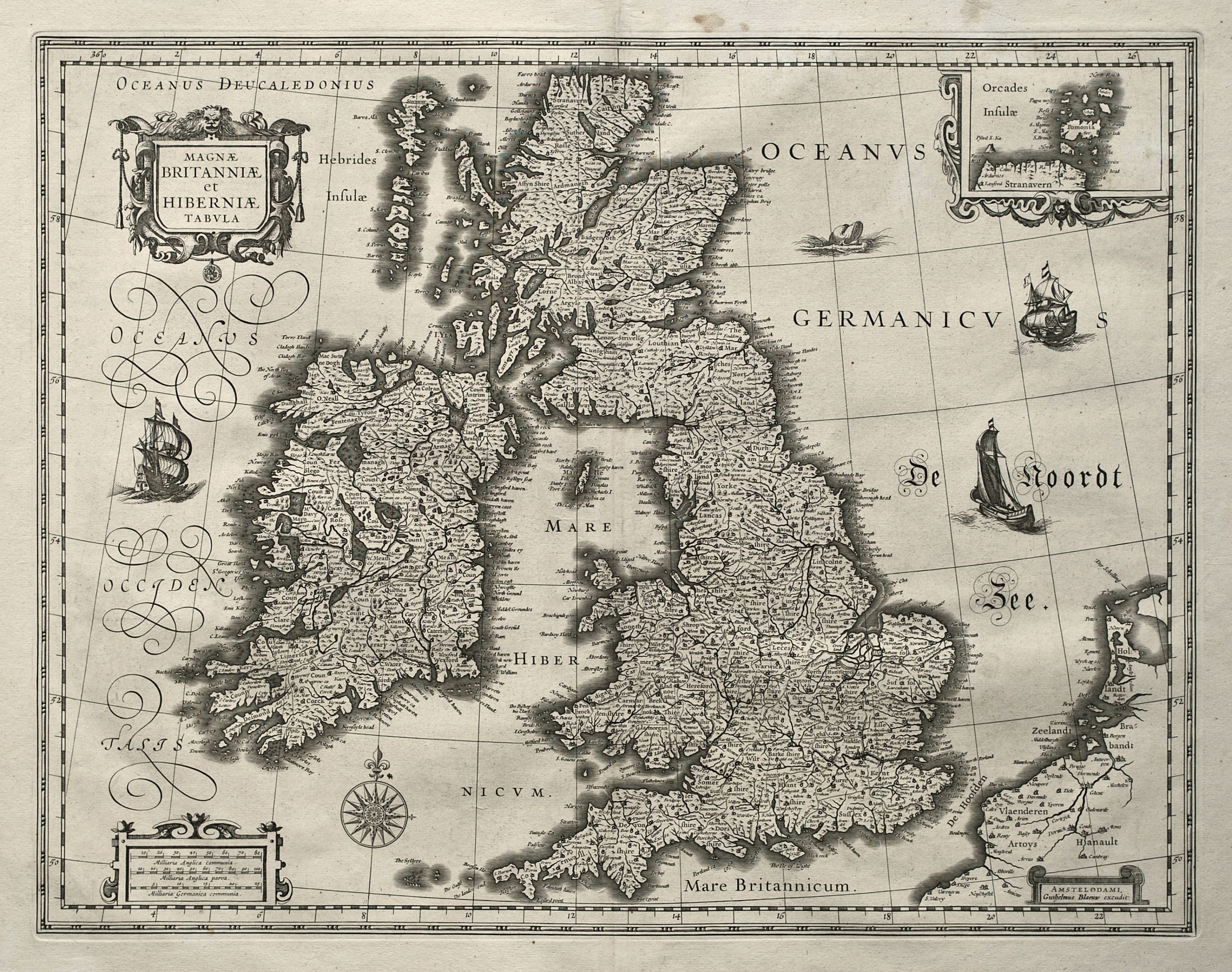 Uncoloured map of the British Isles by Willem Blaeu first published in 1631 in his “Atlas Appendix”. It is essentially reissue of the centre portion of Blaeu’s earlier map of the British Isles without the decorative borders that appeared on all four sides. The map shows Great Britain and Ireland, the coast of northwest France and an inset containing the Orkney Islands. In keeping with engravings issued by the house of Blaeu, the map is finely engraved and includes many decorative embellishments including several sailing ships, a sea monster and a compass rose. Blank verso. The map is a, strong dark impression on heavy stable paper with wide margins in excellent condition. 38.5 cm x 49.5 cm