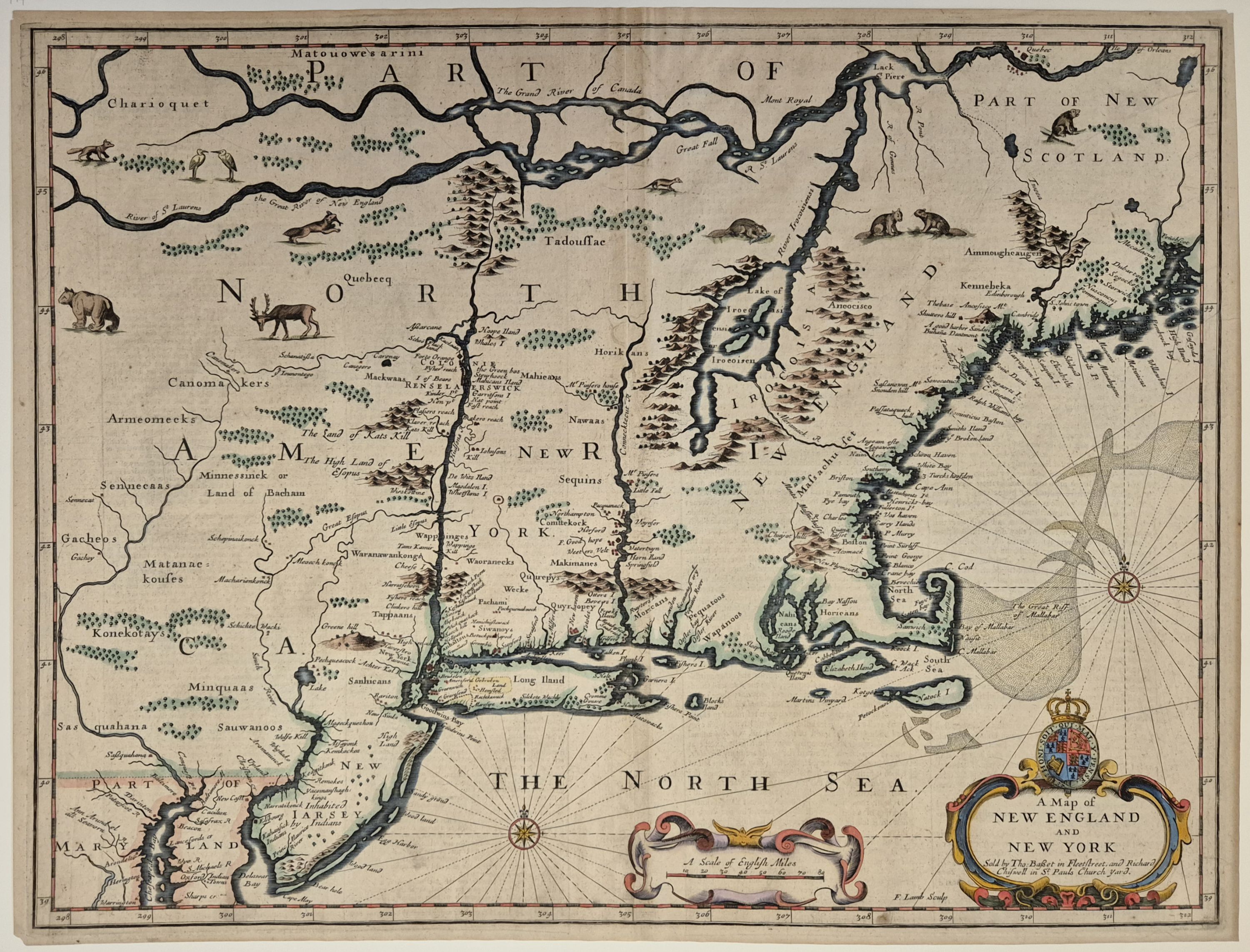 Coloured map of New England and New York from John Speed’s “A Prospect of the Most Famous Parts of the World” that was included only in the 1676 Bassett & Chiswell edition. The map, which was engraved by Francis Lamb, is based on the Jansson-Visscher maps of the region that were initially published in 1636. It is only example from this series published from in English and, as a result, replaces the previous Dutch terms and place names with English ones. The map covers the area from modern-day Maine in the north to British colony of Maryland in the south and includes the settlements of Boston, New York, New Haven, and Baltimore. As little was known of the interior, the area to the west is engraved with names of Native American tribes and images of indigenous animals. A description of the region appears on the verso in English. The map is a finely coloured, lovely example in excellent condition. 38 cm x 50 cm