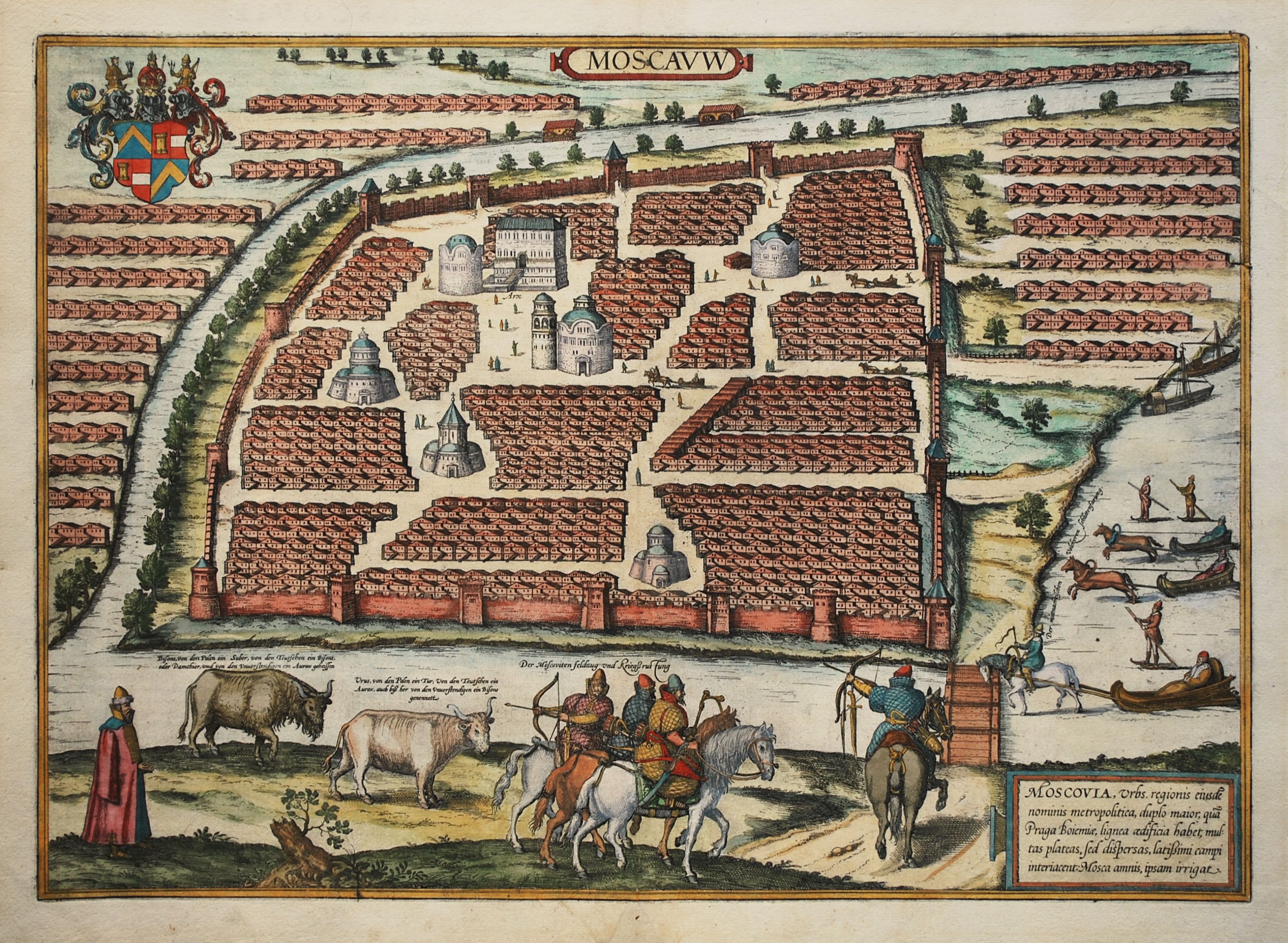 Beautifully coloured plan of Moscow from the landmark Braun & Hogenberg atlas of cities throughout the world entitled “Civitates Orbis Terrarum” first published in 1572. The plate, initially appearing in 1575, displays a bird’s-eye view of the city surrounded by a fortified wall and rivers with five large buildings and churches surrounded by rows of uniform wooden houses. The image appears to be based on a drawing by Sigismund von Herberstein done in 1547 just before the great fire that destroyed much of the old city at the start of the reign of Ivan IV, better known as Ivan the Terrible. At the bottom, shown on a hilltop outside of the city walls are a group of armed soldiers on horseback and on the right are men in horse-drawn sleighs are crossing the frozen Moskva River. A description of Moscow appears verso in French. The map, which has professional repairs to a small hole in the top title cartouche and the bottom centre blank margin, is a lovely, strong dark impression with ample margins on heavy stable paper in very good condition. 35 cm x 49 cm
