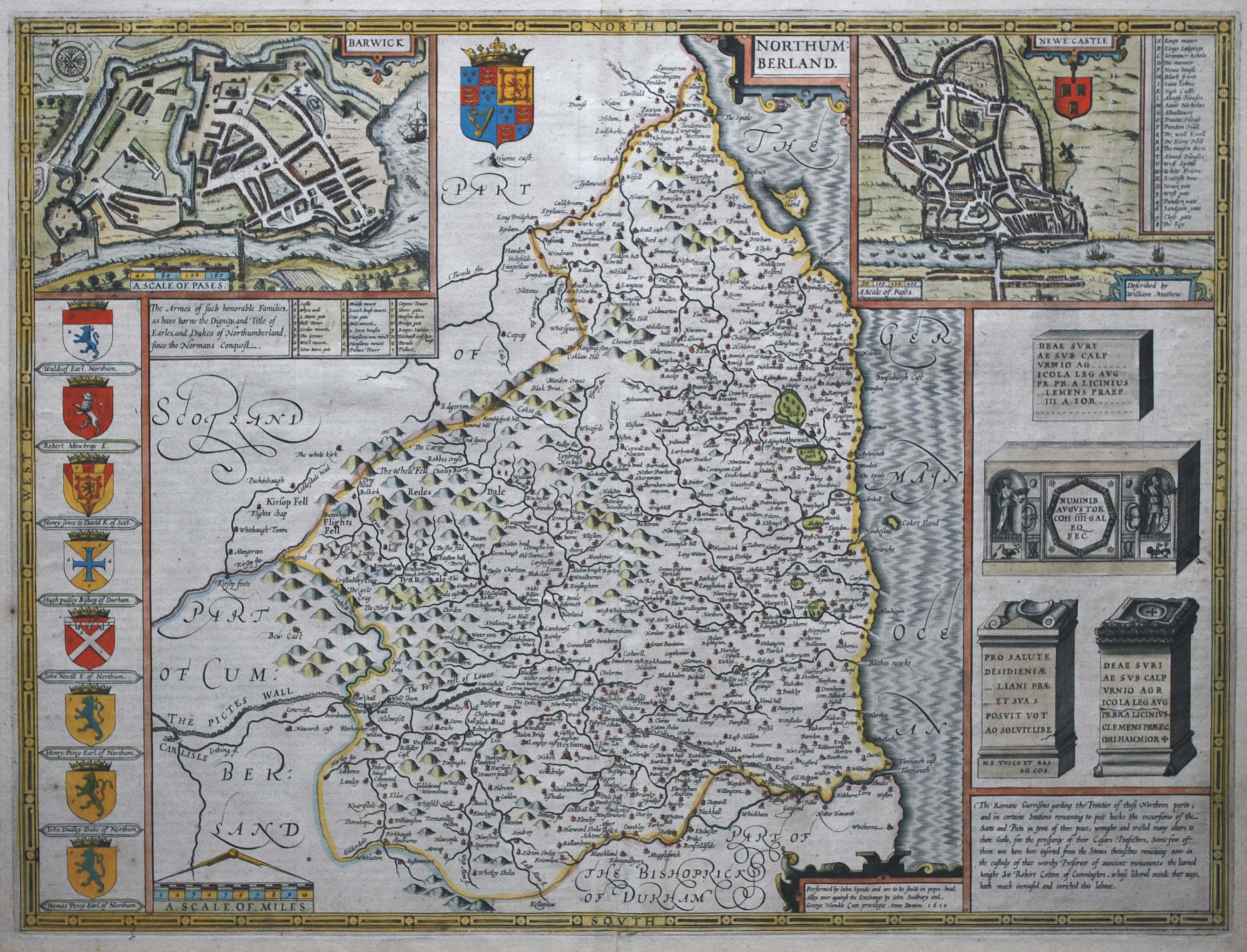 Coloured map of Northumberland from the first edition of John Speed’s “Theatre of the Empire of Great Britain” published by Sudbury & Humble. The map contains town plans of Barwick and Newcastle, each with a key to important locations in the town, a depiction of local Roman antiquities with an explanation of their history and the coats of arms of the noble families of the county. A description of the county appears on the verso in English. The map is a beautifully coloured, strong impression with good margins on heavy stable paper in excellent condition. 38.5 cm x 51 cm