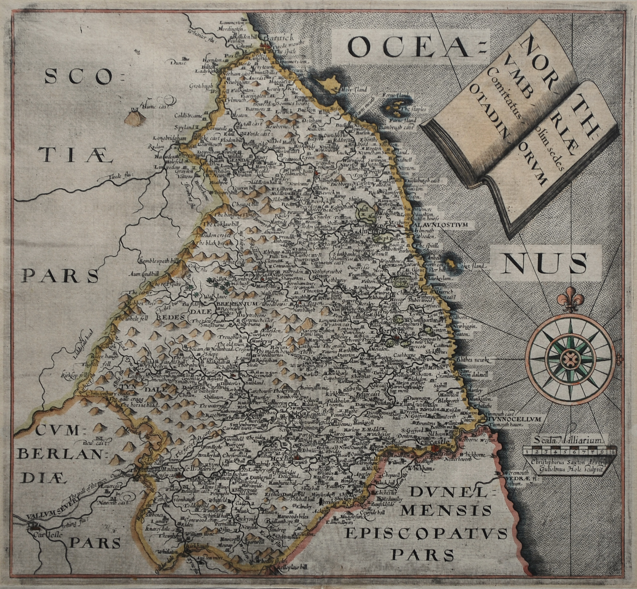 Coloured state 2 map of Northumberland from the ca 1610 English edition of Camden’s Britannia. Initially issued in 1607, Britannia was the first publication that contained a complete set of individual county maps of England and Wales. The county maps in Britannia were based on the work of Christopher Saxton and John Norden and were engraved by William Hole and William Kip. Blank verso. A finely coloured example in very good condition. 27 cm x 29.5 cm