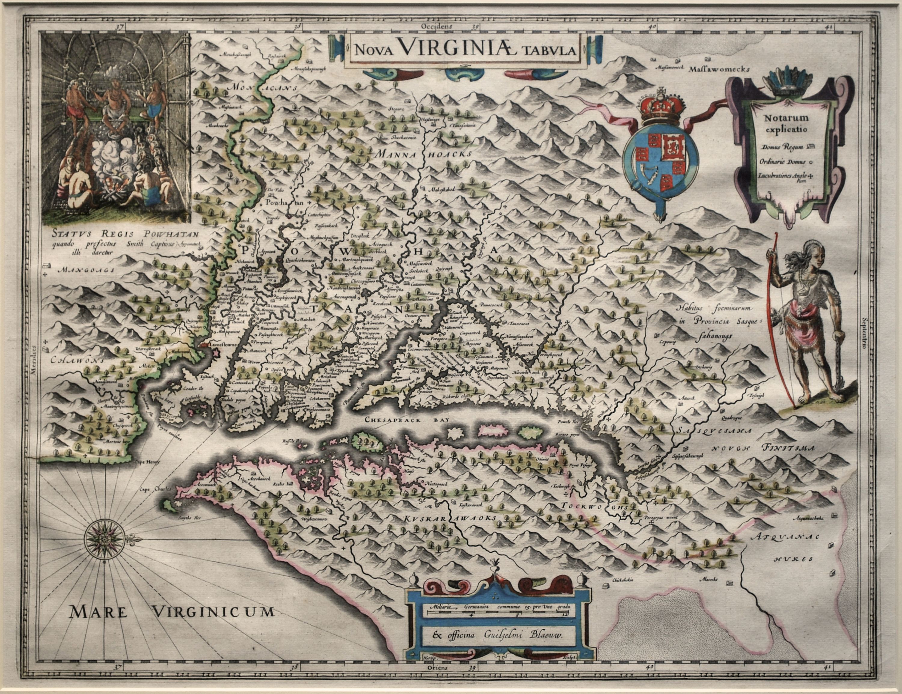 Coloured map of Virginia and the surrounding region from a French edition of Blaeu’s atlas of the world entitled “Theatrum Orbis Terrarum, Sive Atlas Novus”. The plate was originally engraved by Jodocus Hondius Jr. in 1618 and was subsequently purchased by Willem Blaeu in 1629, who inserted his name in place of Hondius in the publisher’s cartouche and included it in the family’s atlases during the next 40 years. Showing the discoveries of John Smith and retaining the details and orientation to the west originally shown in Smith’s 1612 map, it is decorated with a scene of the chief of the Powhatan with members of his tribe in a lodge, a Susquehanna Indian, a “Notarum Explicatio”, or key, that identifies habitation types and a large British royal coat of arms. A description of Virginia appears verso in French. The map is a strong dark impression on heavy, stable paper with ample margins in excellent condition. 37 cm x 48.5 cm