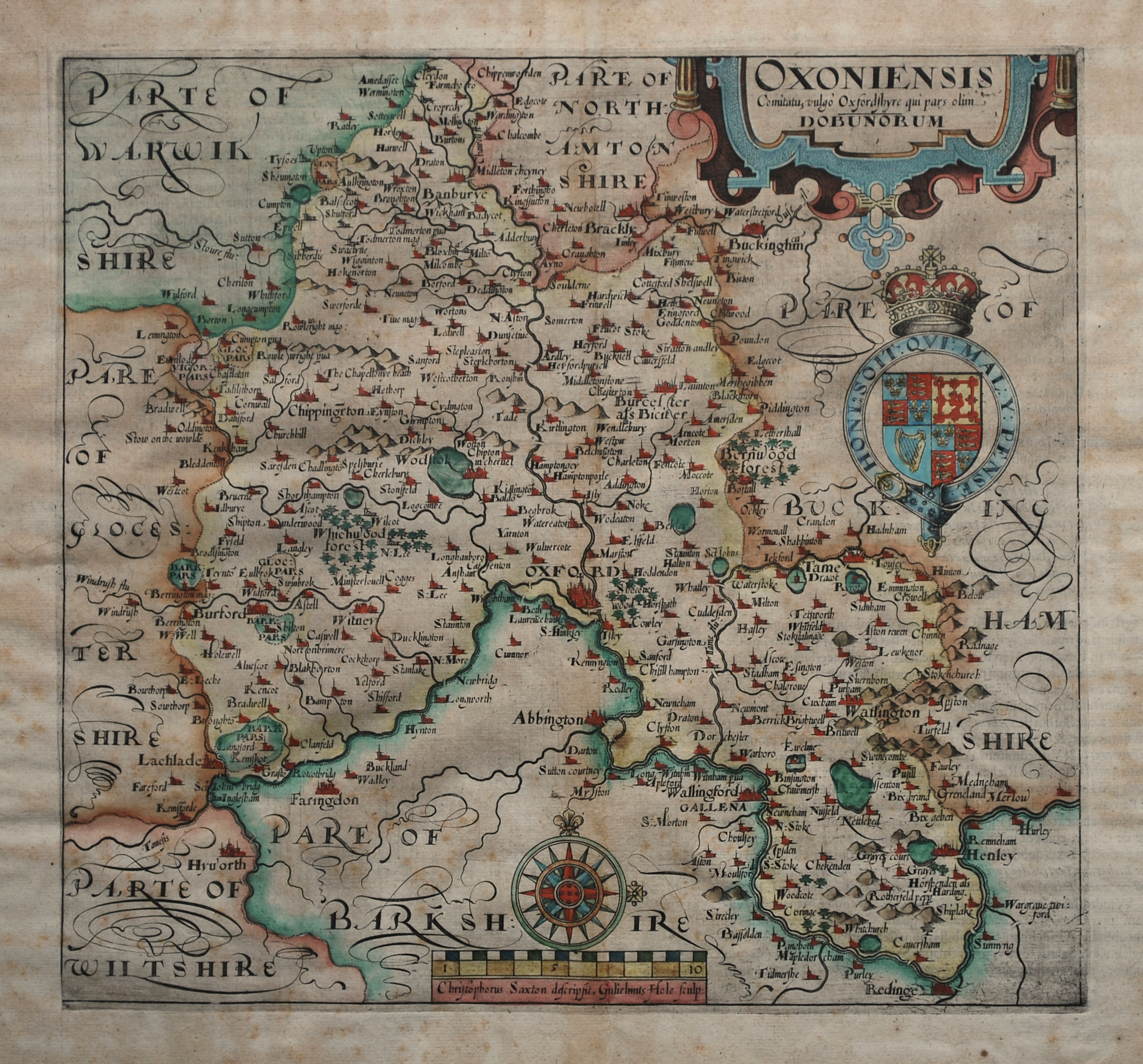 Coloured state 1 map of Oxfordshire from the 1607 edition of Camden’s Britannia. Initially issued in 1607, Britannia was the first publication that contained a complete set of individual county maps of England and Wales. The county maps in Britannia were based on the work of Christopher Saxton and John Norden and were engraved by William Hole and William Kip. The map is decorated with an ornate title cartouche, the Royal coat of arms and a compass rose. A description of Oxfordshire appears verso in Latin. Other than some discolouration mainly in the margins, a finely coloured example in excellent condition. 27 cm x 29 cm