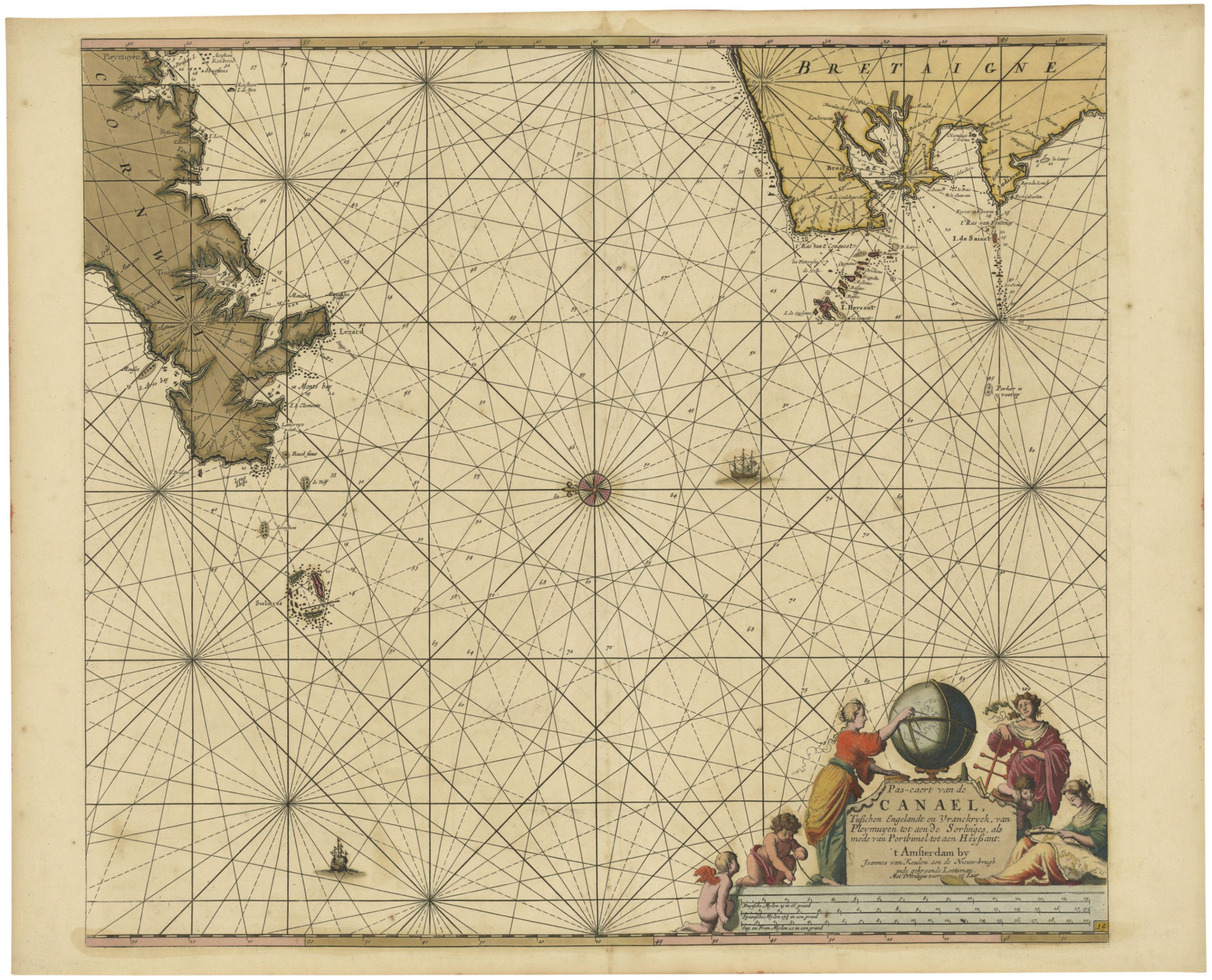 Old-coloured sea chart, heightened with gold, from Volume 1 of Johannes van Keulen’s atlas of sea charts entitled “De Nieuwe Groote Lichtende Zee-Fackel” first published in Amsterdam in 1680. The atlas proved to be very popular and continued to be published throughout the 18th century, during which time it was expanded to six volumes by his heirs including Gerard, Johannes II and Gerard Hulst. This chart, which is oriented to the east, covers the western portion of the English Channel. Cornwall is shown from the Isles of Scilly (“Sorlinges”) in the west to Plymouth (“Pleymuyen”) in the east; along with the north-west coast of Brittany centred on the city of Brest. The chart is decorated with a title cartouche surrounded by three female cartographers with their instruments and charts, sailing ships and a compass rose. Blank verso. Other than some minor discolouration, a lovely old-coloured example in very good condition. 50 cm x 56 cm