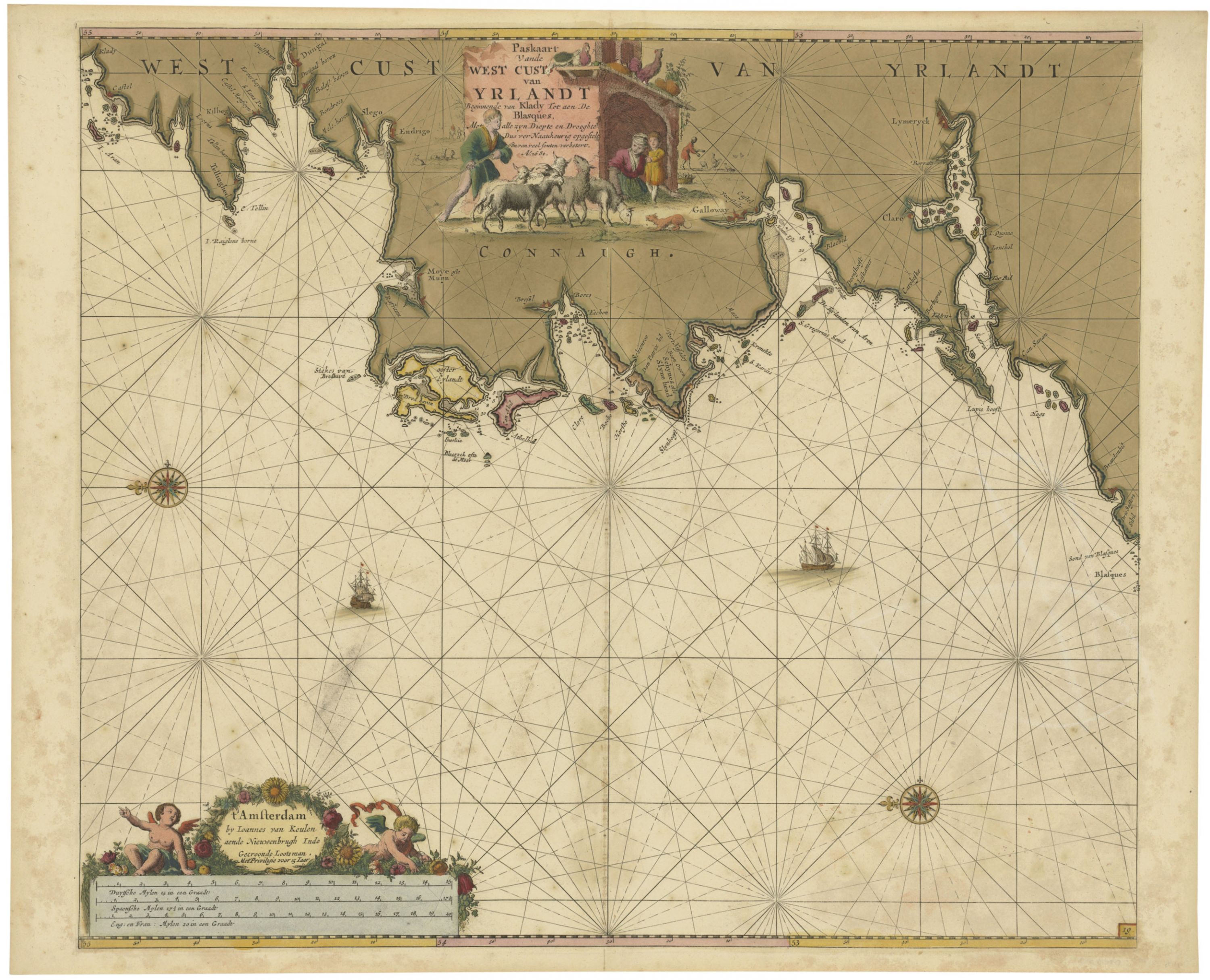 Old-coloured sea chart, heightened with gold, from Volume 1 of Johannes van Keulen’s atlas of sea charts entitled “De Nieuwe Groote Lichtende Zee-Fackel” first published in Amsterdam in 1680. The atlas proved to be very popular and continued to be published throughout the 18th century, during which time it was expanded to six volumes by his heirs including Gerard, Johannes II and Gerard Hulst. This chart, which is oriented to the east, covers the west coast of Ireland from the island of Arranmore (“I. Aran”) in the north to the area just to the north of Dingle Bay in the south, showing the cities of Galway (“Galloway”) and Limerick (“Lymeryck”). The chart is decorated with a title cartouche surrounded by a pastoral scene, compass roses and sailing ships. Blank verso. Other than some minor discolouration and repairs to the centrefold, a finely coloured example in very good condition. 50 cm x 58 cm