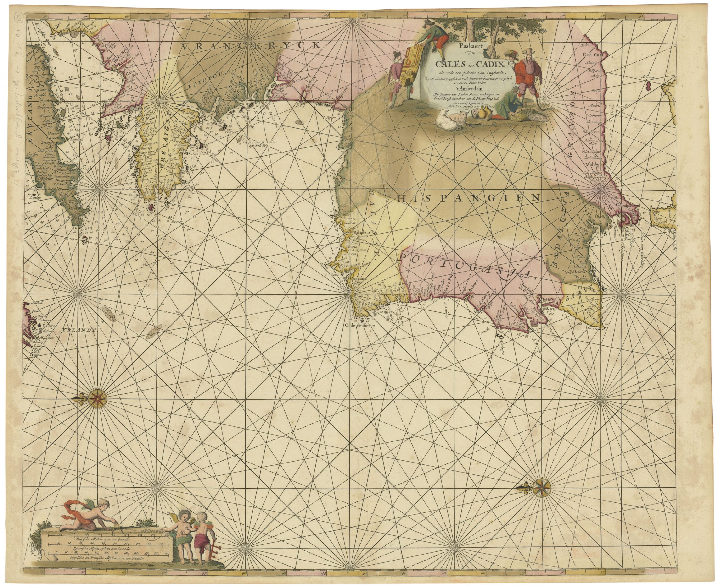 Old-coloured sea chart, heightened with gold, from Volume 1 of Johannes van Keulen’s atlas of sea charts entitled “De Nieuwe Groote Lichtende Zee-Fackel” first published in Amsterdam in 1680. The atlas proved to be very popular and continued to be published throughout the 18th century, during which time it was expanded to six volumes by his heirs including Gerard, Johannes II and Gerard Hulst. Starting from the northwest coast of Africa near Tangier, this chart, which is oriented to the east, follows the Atlantic coastline of Europe from the Iberian Peninsula to the southern coasts of England and Ireland. The chart is decorated with a title cartouche surrounded by a pastoral scene with two men hoisting a coat of arms and two compass roses. Blank verso. The chart has a significant repair to verdigris damage on the northeastern Spanish coastline area from Gijón east to the border with France; otherwise, apart from some minor discolouration, a lovely old-coloured example in good condition. 51.5 cm x 60.5 cm