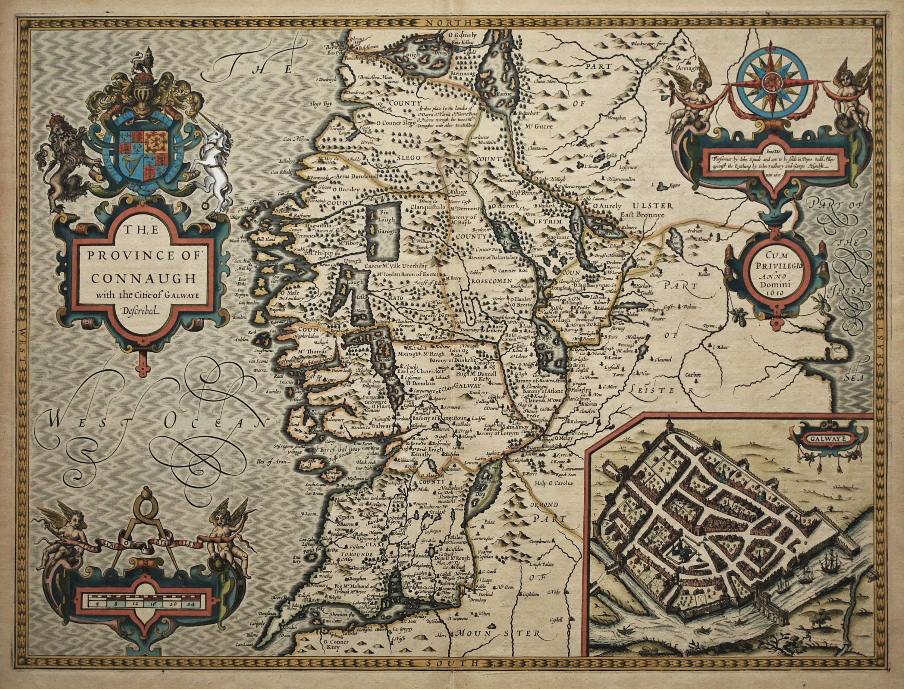 Coloured map of the Irish province of Connaught taken from a ca 1646 William Humble edition of John Speed’s “Theatre of the Empire of Great Britain”. Certainly the most decorative map of the province, it contains a plan of the city of Galway along with three very ornate cartouches and the Royal coat of arms. A description of the province appears on the verso in English. The map is a finely coloured strong, dark impression on heavy, stable paper in excellent condition. 38.5 cm x 51.5 cm