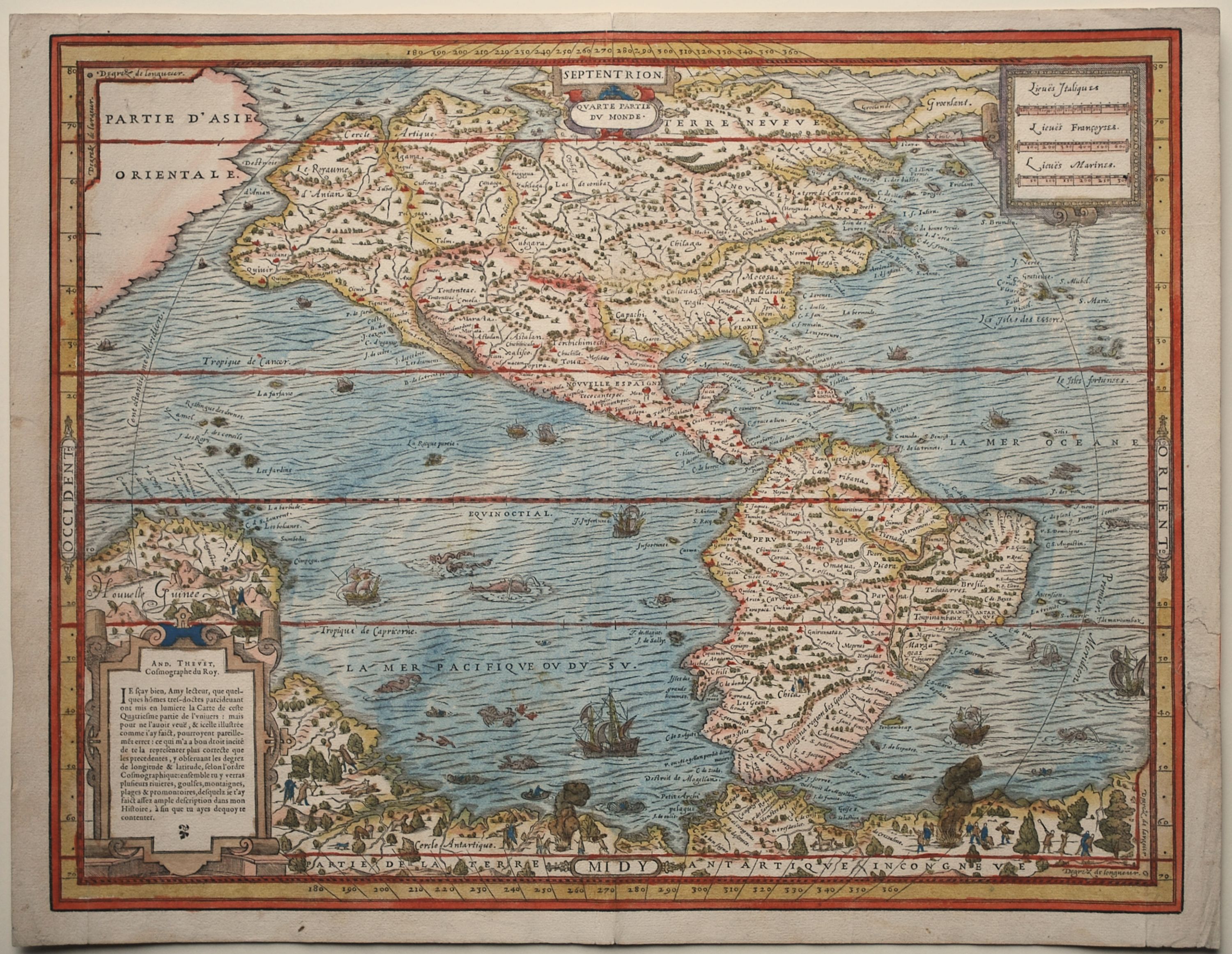 Uncommon coloured wood-cut map of the Americas taken from the first edition of Thevet’s “La Cosmographie Universelle” first published in 1575. According to Burden, the map appears in two further states, state 2 - from the second edition of the book (also in 1575) and state 3 – separately published examples from 1581. Thevet was a Franciscan monk who travelled to the Americas and included his observations in La Cosmographie. The geography of Americas is based principally on Mercator’s 1569 map with the oversized west coast of North America and the bulges on the south-west and north-east coasts of South America. A large, heavily forested southern continent (“Antartique Incongneue”) fills the bottom of the map, merging with New Guinea in the far west and containing scenes of local inhabitants going about their lives. At the top, the north-eastern part of the Asian continent with the Strait of Anian is shown in the west and a strangely elongated Greenland in the east. This finely engraved map, which takes in large parts of the Atlantic and Pacific Oceans and perpetuates the myth of the phantom island of Frisland in the north Atlantic, is decorated with two strapwork cartouches, numerous sailing ships and sea monsters. Blank verso. The map has a repair to the right margin that just enters the printed border and short centrefold splits to the blank top and bottom margins, otherwise a finely coloured, dark impression in excellent condition. 35 cm x 45 cm