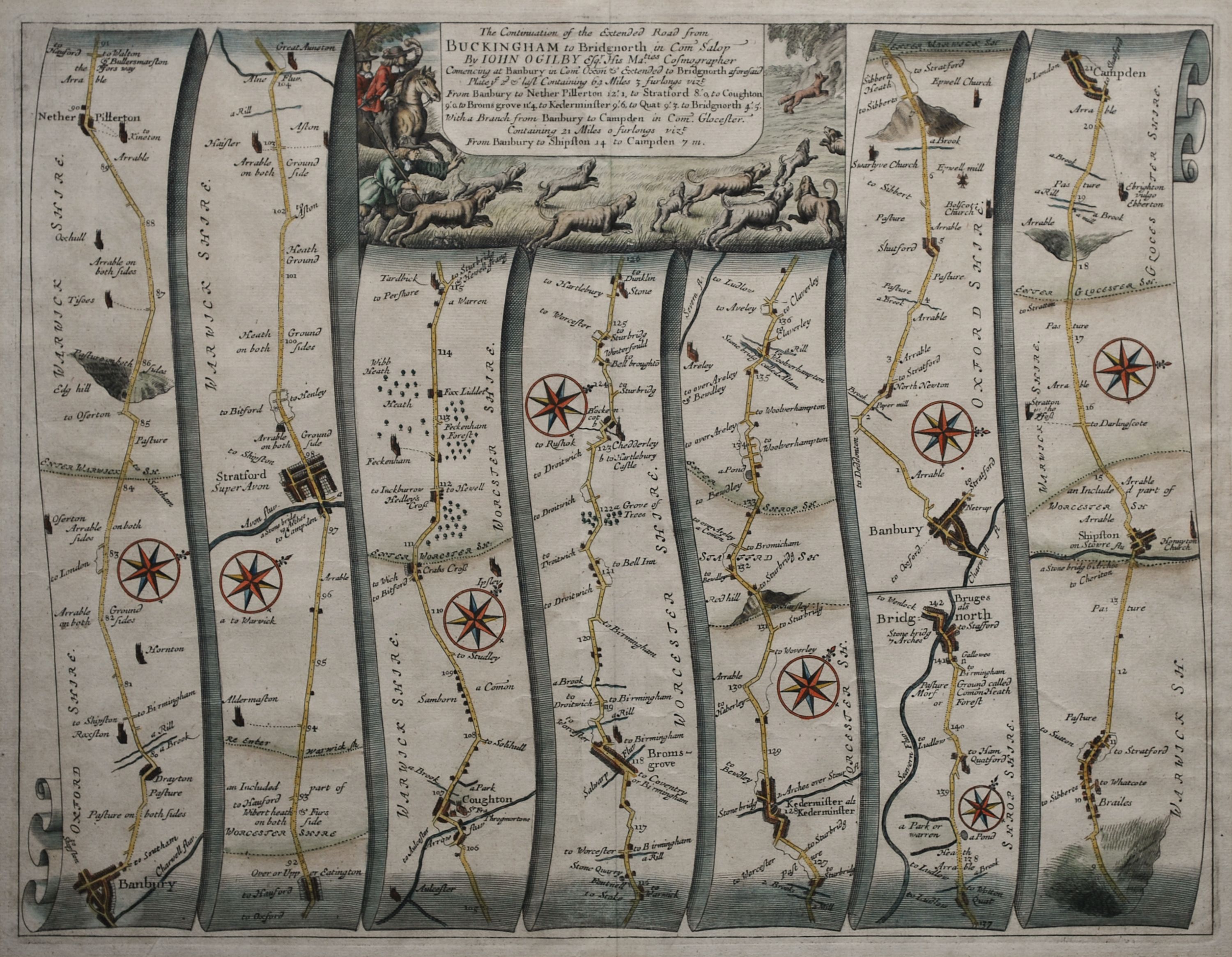 Coloured first state strip map (without number at bottom) of the coaching route from Banbury to Bridgnorth as well as the route from Banbury to Chipping Campden taken from Ogilby’s opus entitled “Britannia”, the first national road atlas of any country in Western Europe and first published in 1675. The map has a decorative cartouche illustrating a country based fox hunting scene and containing a description of the two routes that indicates the main towns on each route and the distances between them. Blank verso. Other than some minor marginal imperfections not affecting the image, the map is a finely coloured, sharp dark impression on heavy paper with wide margins and is in very good condition. 34 cm x 44.5 cm