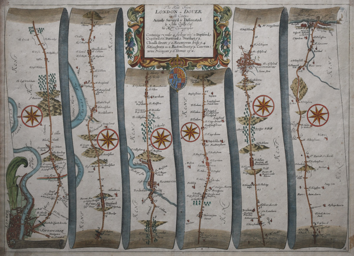 Finely coloured strip map of the coaching route from London to Dover taken from a ca 1698 edition of Ogilby’s opus entitled “Britannia”, the first national road atlas of any country in Western Europe and first published in 1675. The 71 mile route starts from the London and goes through the towns of Dartford, Rochester, Canterbury and terminating in Dover. The map has a decorative cartouche indicating the main towns on the route and the distances between them. Blank verso. Other than a small rust hole and some faint marks in the margins from prior framings, the map is in very good condition. 32 cm x 44.5 cm