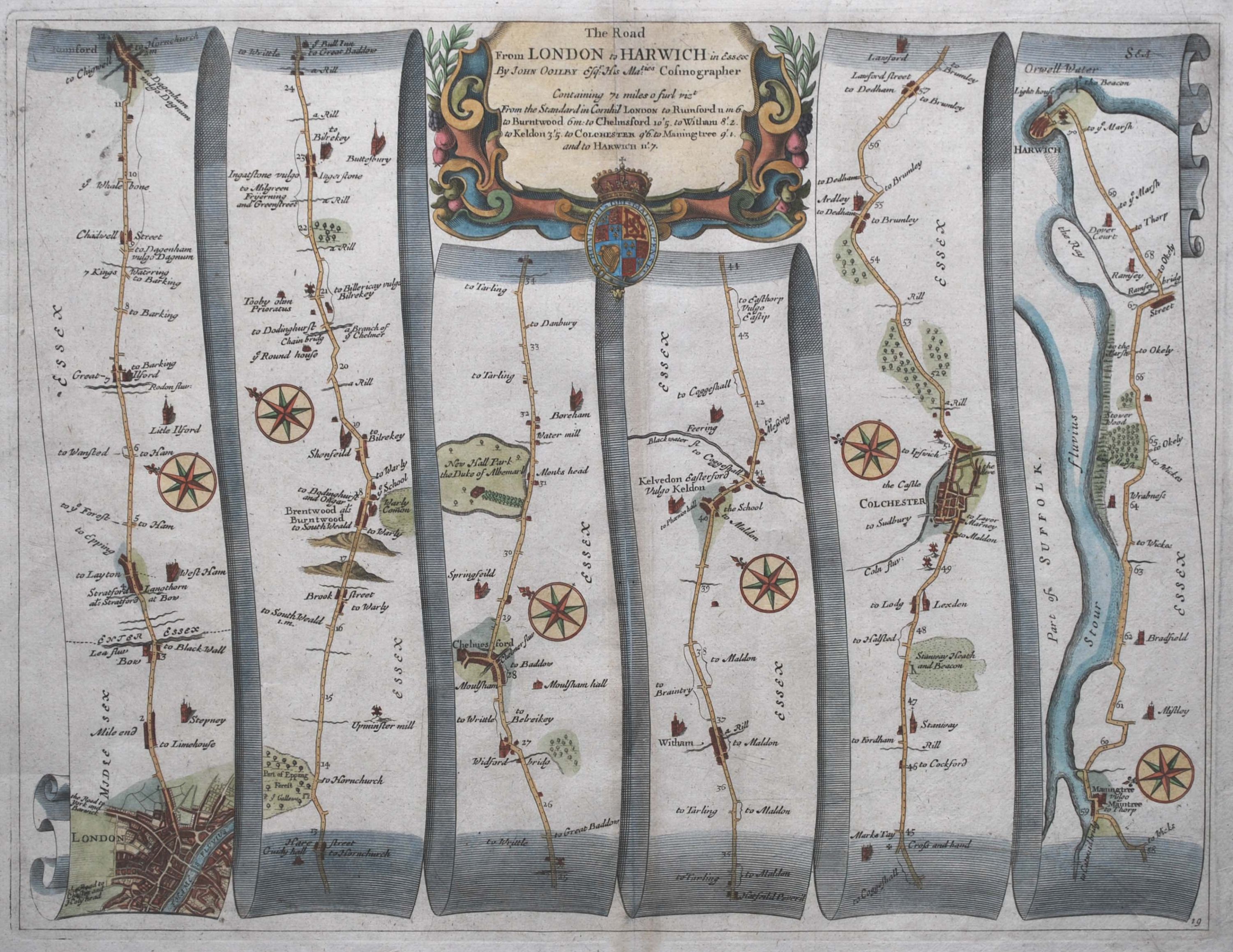 Coloured strip map of the coaching route from London to Harwich taken from Ogilby’s opus entitled “Britannia”, the first national road atlas of any country in Western Europe and first published in 1675. The map has a decorative cartouche containing a description of the 71 mile route that indicates the main towns on the route and the distances between them. The route starts from the Standard in Cornhill, London and proceeds in a generally north-eastern direction through the towns of Ilford, Rumford, Brentwood, Chelmsford, Kelvedon, Colchester, Manningtree and terminating in Harwich. Blank verso. The map is in excellent condition. 33.5 cm x 44 cm