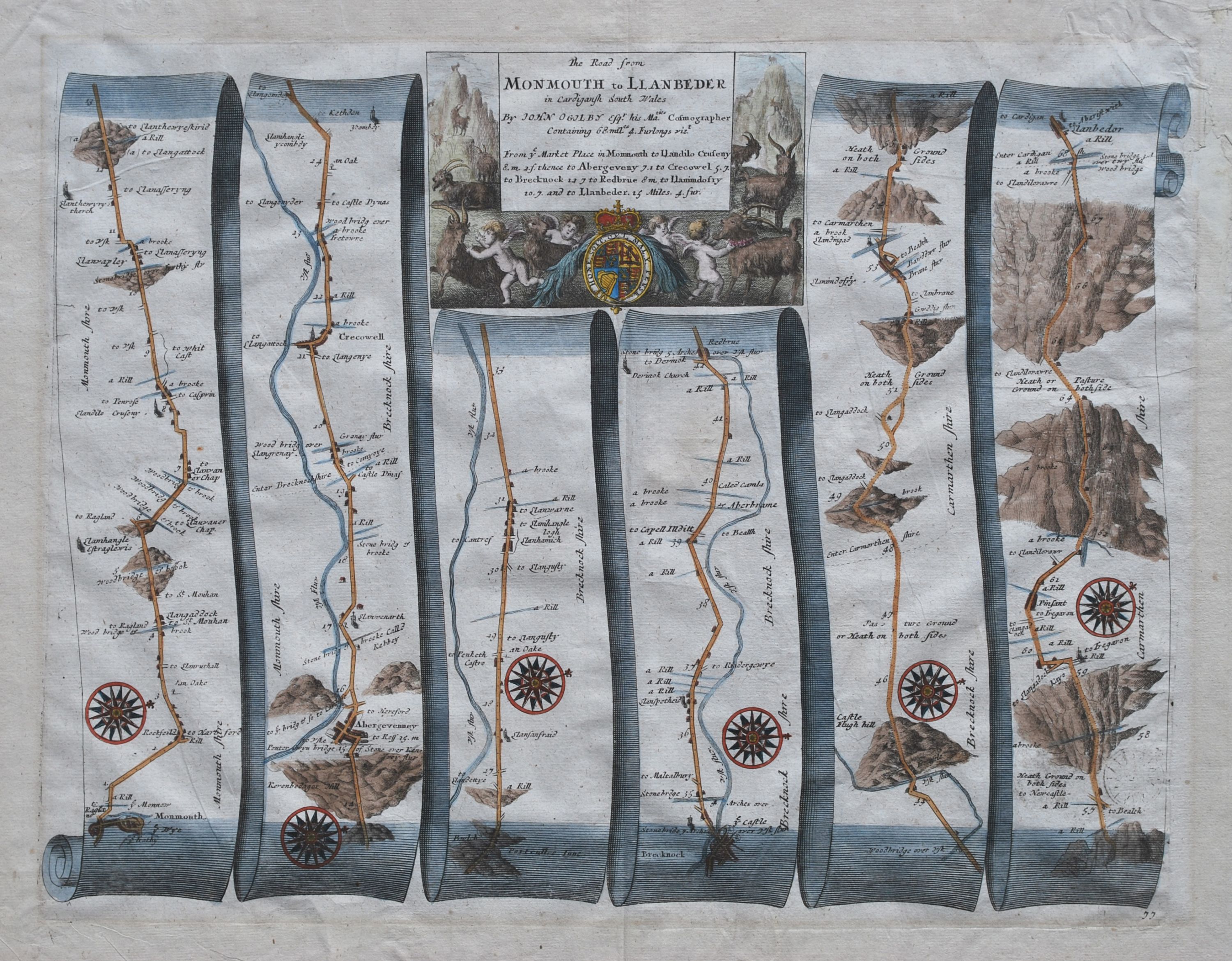 Coloured strip map of the coaching route from Monmouth to Llanbeder taken from a ca 1698 edition of Ogilby’s opus entitled “Britannia”, first published in 1675. The 68 mile route starts from Monmouth and proceeds on a generally western route through the towns of Abergeveny, Crecowel, Brecknoch, Redbrue, Llanimdofry and Llanbeder. The map has a cartouche decorated with the royal coat of arms, long-horned goats and cherubs as well as showing the main towns on the route and the distances between them. Blank verso. Other than some marginal imperfections including repairs to the right margin; a nicely coloured example of this map in good condition. 32.5 cm x 43 cm