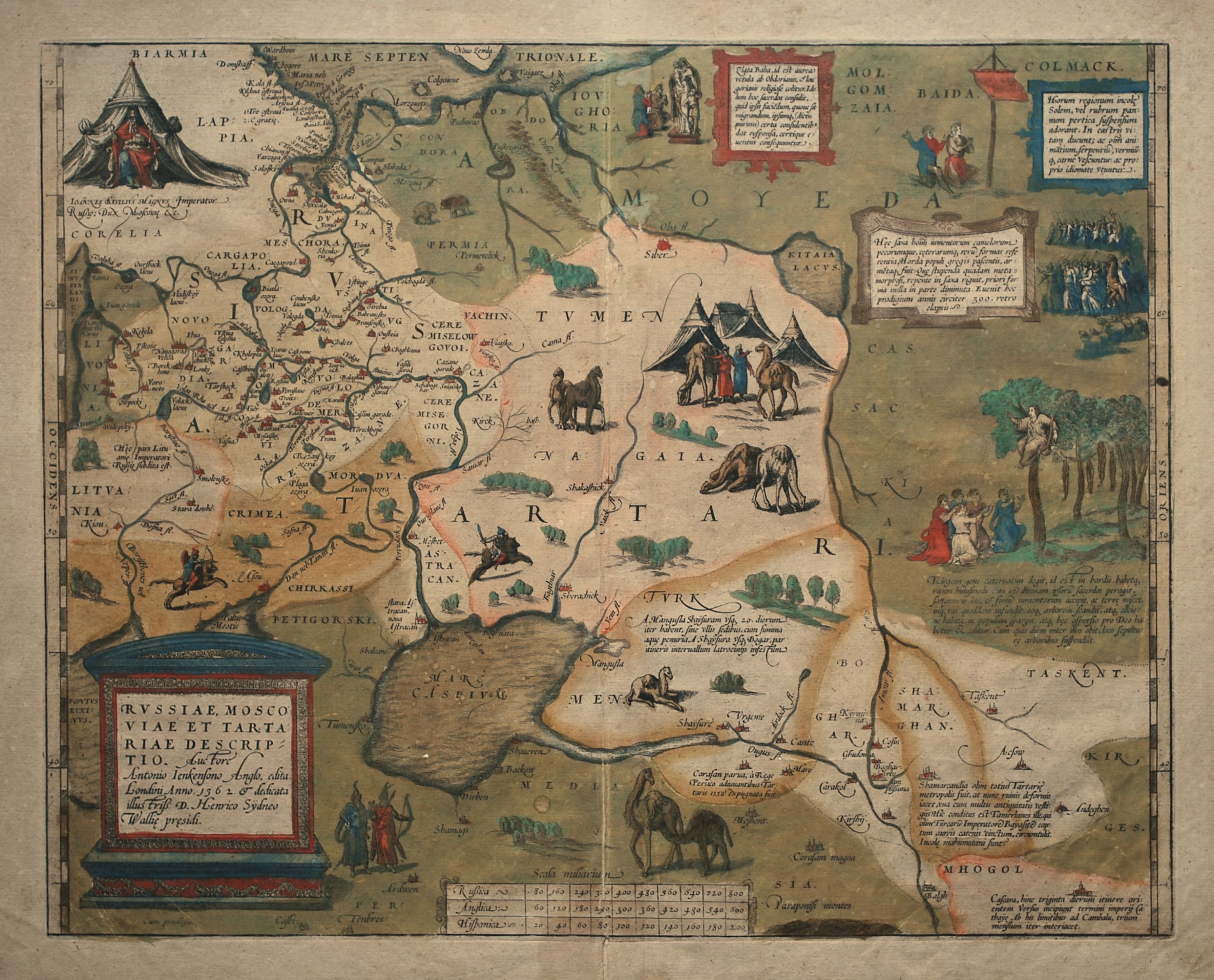 Old coloured map of Russia from the early 1571 Latin edition of Abraham Ortelius’ landmark atlas “Theatrum Orbis Terrarum”, the first modern atlas of the world. This map, which was included in the Ortelius atlas since 1570 and covers the area from the Baltic States in the east to Tashkent and the Cossack regions in the west, is based on now lost Anthony Jenkinson’s 1562 map of the region based on his travels with the English Moscovy Company. It is decorated with several depictions of indigenous people and animals, including a very strange one showing a burial ritual in which the deceased are hung from trees. A description of Russia appears on the verso in Latin. Other than some toning to the paper and a few pin-holes, the map is a lovely old coloured example in very good condition. 35 cm x 44.5 cm