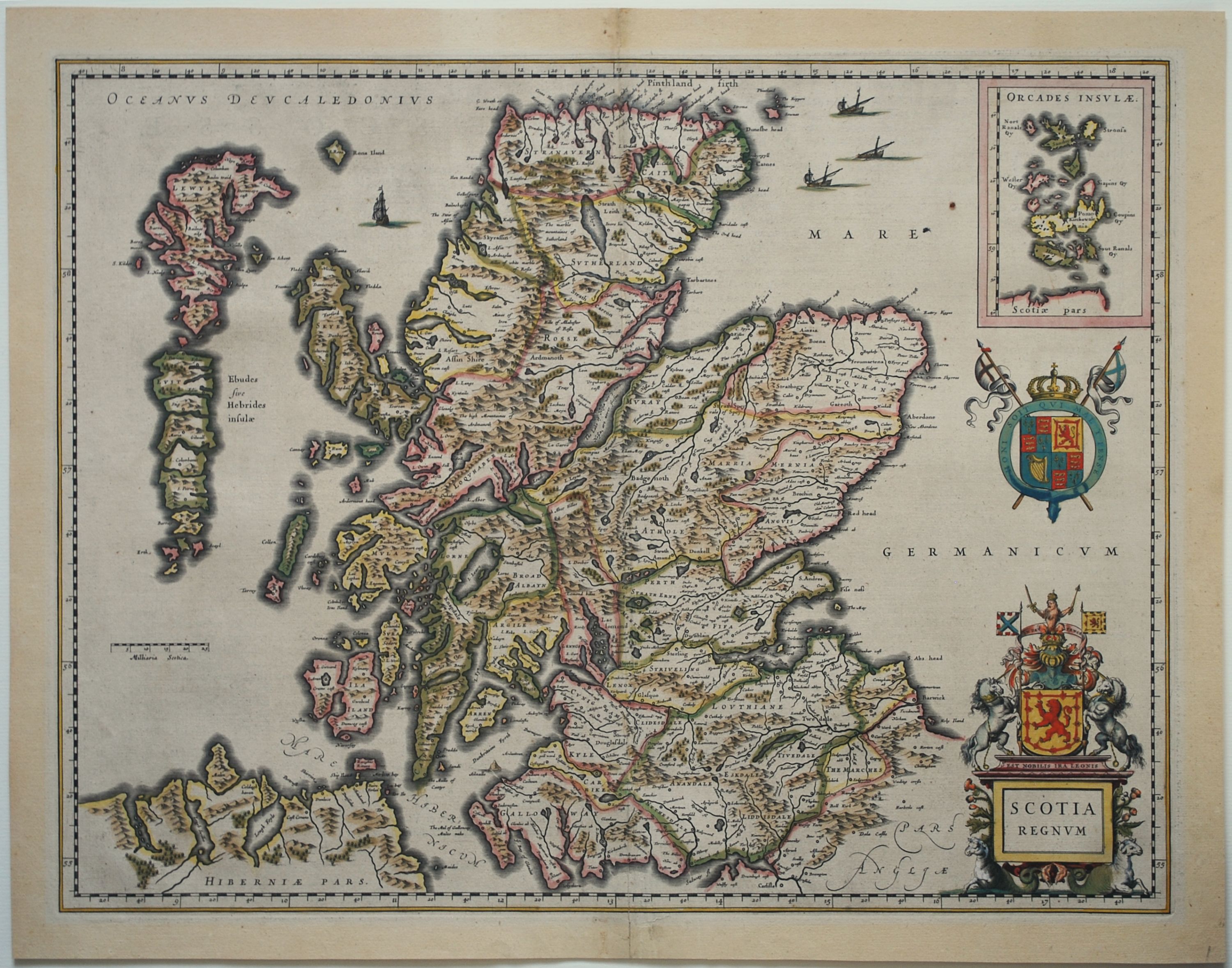 Old coloured map of Scotland by Willem Blaeu from his “Atlas Novus” that was first published in two volumes in 1634. Based on the work of Mercator and John Speed, it continued to appear in Blaeu’s atlas until 1654, when it was replaced by an updated map using surveys by Robert Gordon of Straloch in the first atlas devoted solely to Scotland entitled “Theatrum Scotiae” published by Willem’s son Joan. This detailed, finely engraved map shows the whole of mainland Scotland, its western isles including the Hebrides, Lewis and Skye, and an inset top left containing the Orkney Islands. The map is decorated with a finely engraved title cartouche supporting the Scottish Royal Coat of Arms, several sailing ships and the British Royal Coat of Arms. A description of Scotland appears verso in French. Other than a minor repair to the bottom centrefold and mild toning in the blank margins, it is a lovely example in excellent condition. 38 cm x 49.5 cm